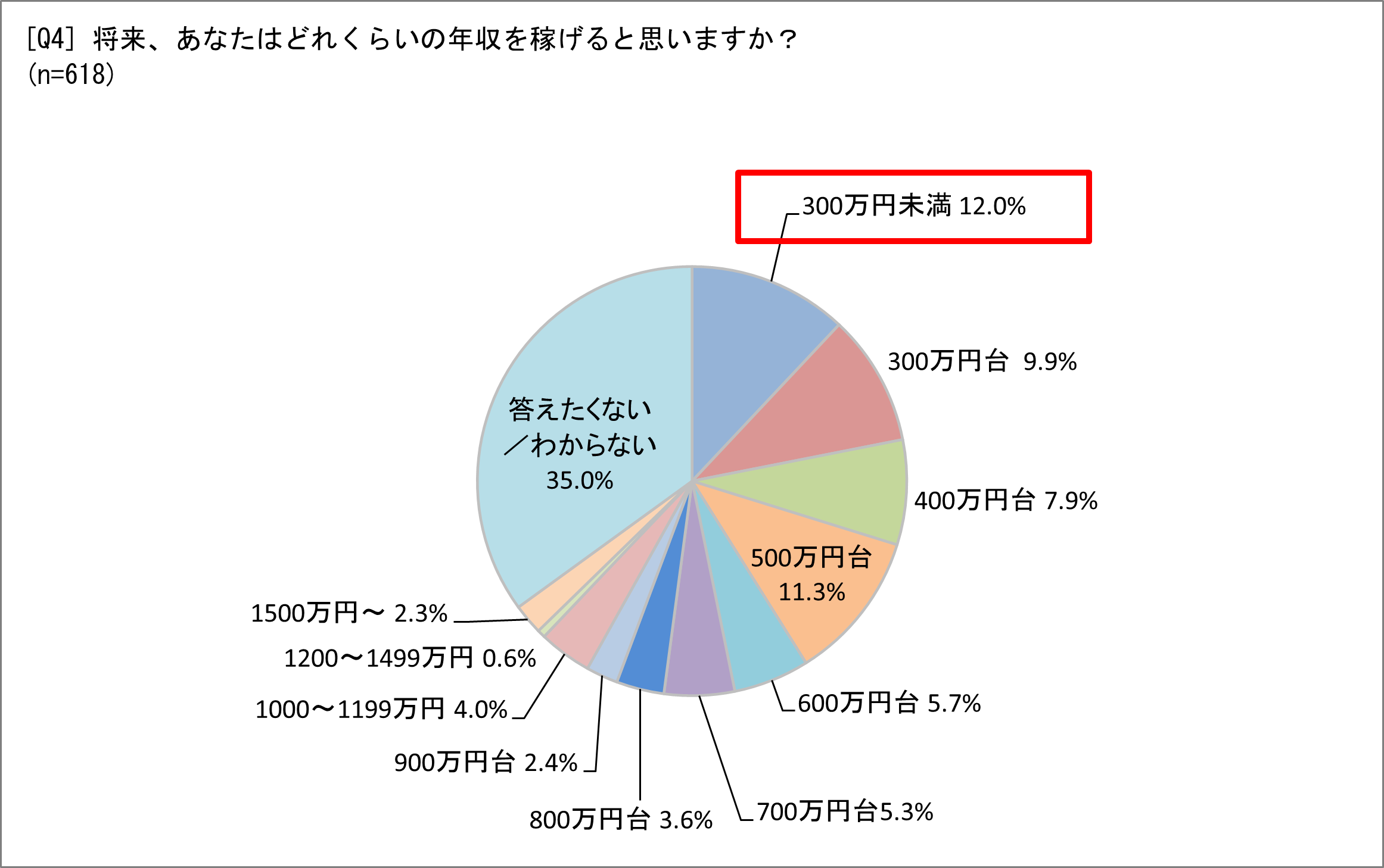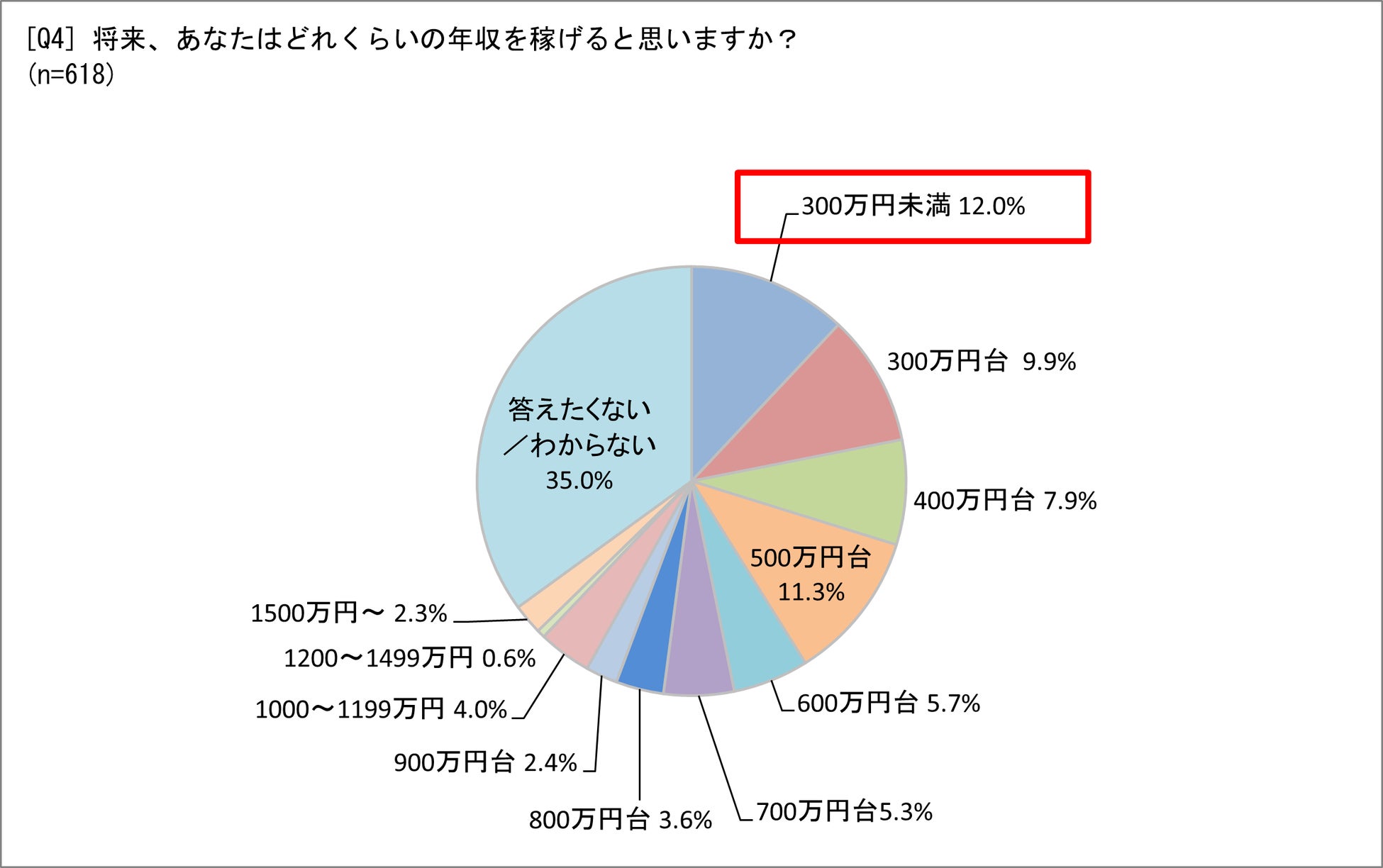 本調査では、「将来、お金持ちになりたい」と回答した高校生が全体の78.0%を占めたのに対し、「お金持ちになれると思う」と回答した高校生は20.8%に留まり〈Q1〉、高校生の理想と現実のギャップが明らかになっています。また、将来自分が稼げると思う年収には「300万円未満」と回答した高校生が最も多く(「答えたくない・わからない」を除く)〈Q4〉、高校生が現実的な金銭感覚を持っていることが浮き彫りになりました。