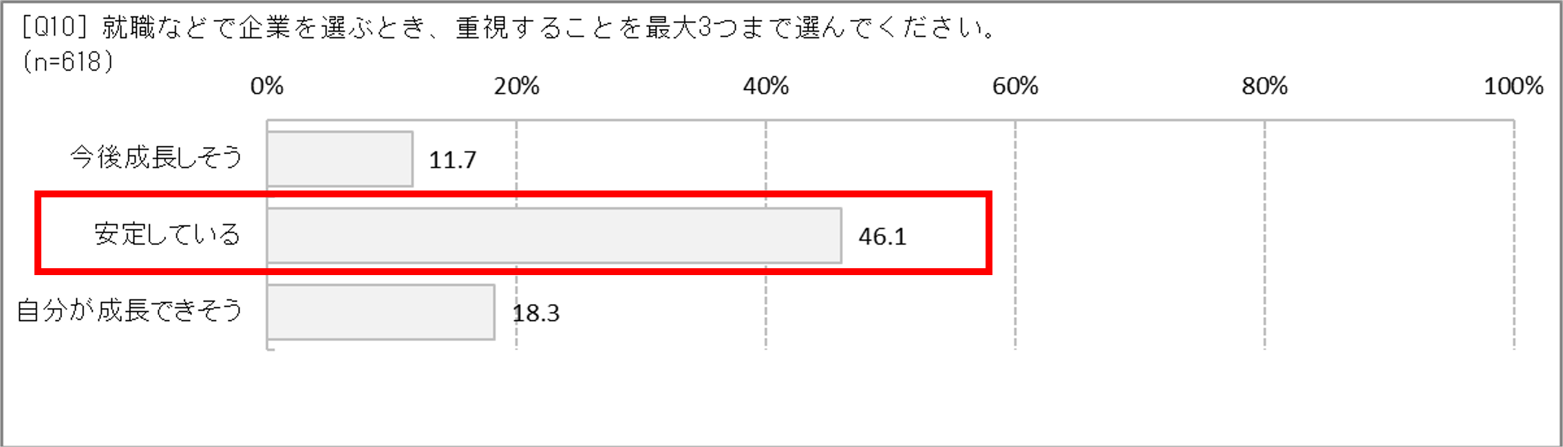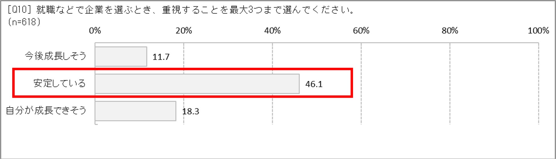 また、就職などで企業を選ぶときに重視することへの質問では、「安定している」を選択した高校生が46.1%と最も多く、「今後成長しそう」(11.7%)「自分が成長できそう」(18.3%)を大きく上回るなど、堅実な様子も明らかになっています〈Q10〉。
