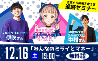 12月16日(土)19時00分から「みんなのミライとマネー」と題したオンラインセミナーを実施します。今回の調査の結果を高校生とシェアしながら、高校生のリアルなお金についての意識に迫ります。参加無料・予約不要。