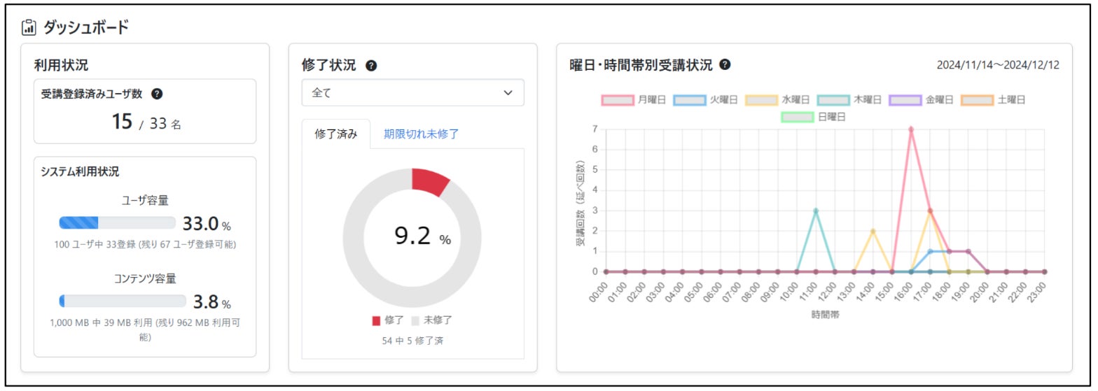 ・受講登録済みユーザ数、システムに登録可能なユーザやコンテンツの残り容量を示す「利用状況」
