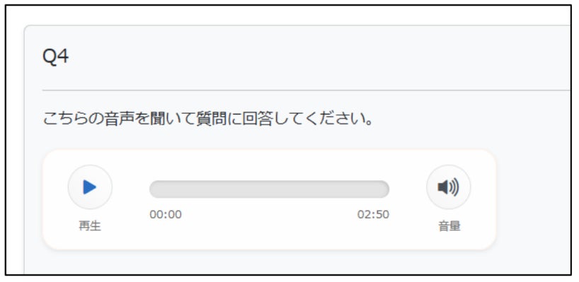 回答時は、受講画面に下記の音声プレーヤーが表示され、受講者はプレーヤーで音声を再生した上で問題に回答します。