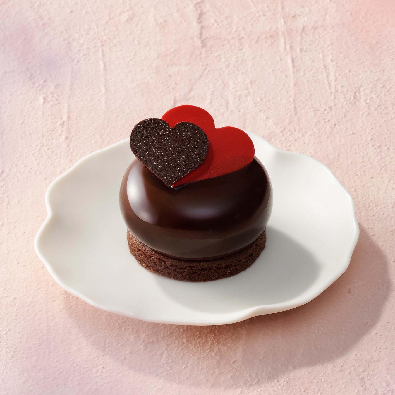 コクのあるショコラムースで甘酸っぱいフランボワーズジュレを包み、ショコラサブレにのせました。バレンタインにおすすめの華やかなケーキです。