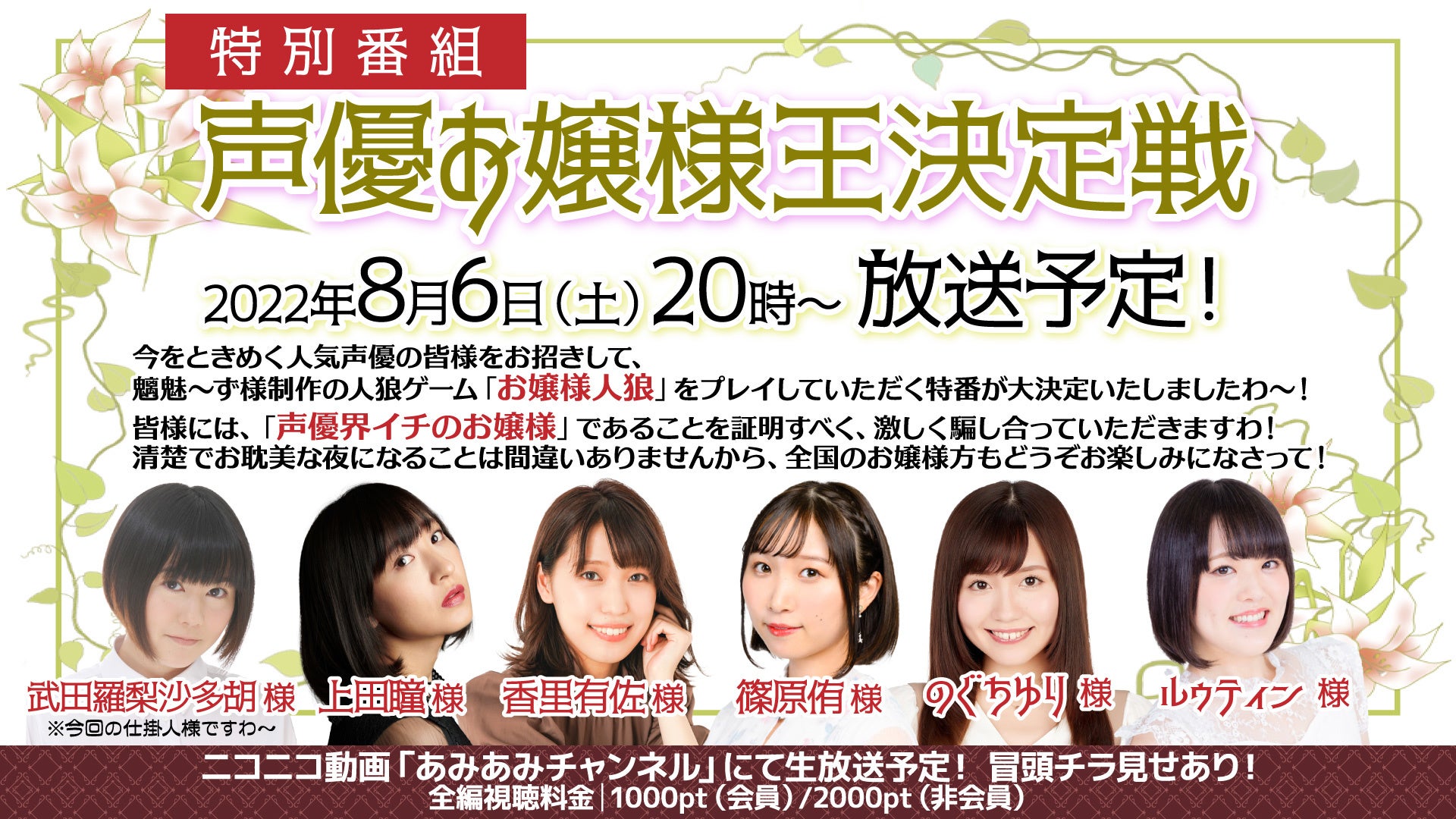 - 『あみあみ』がお送りするニコニコ動画「あみあみチャンネル」にて、特別番組「声優お嬢様王決定戦」が、2022年8月6日(土)20時から放送。