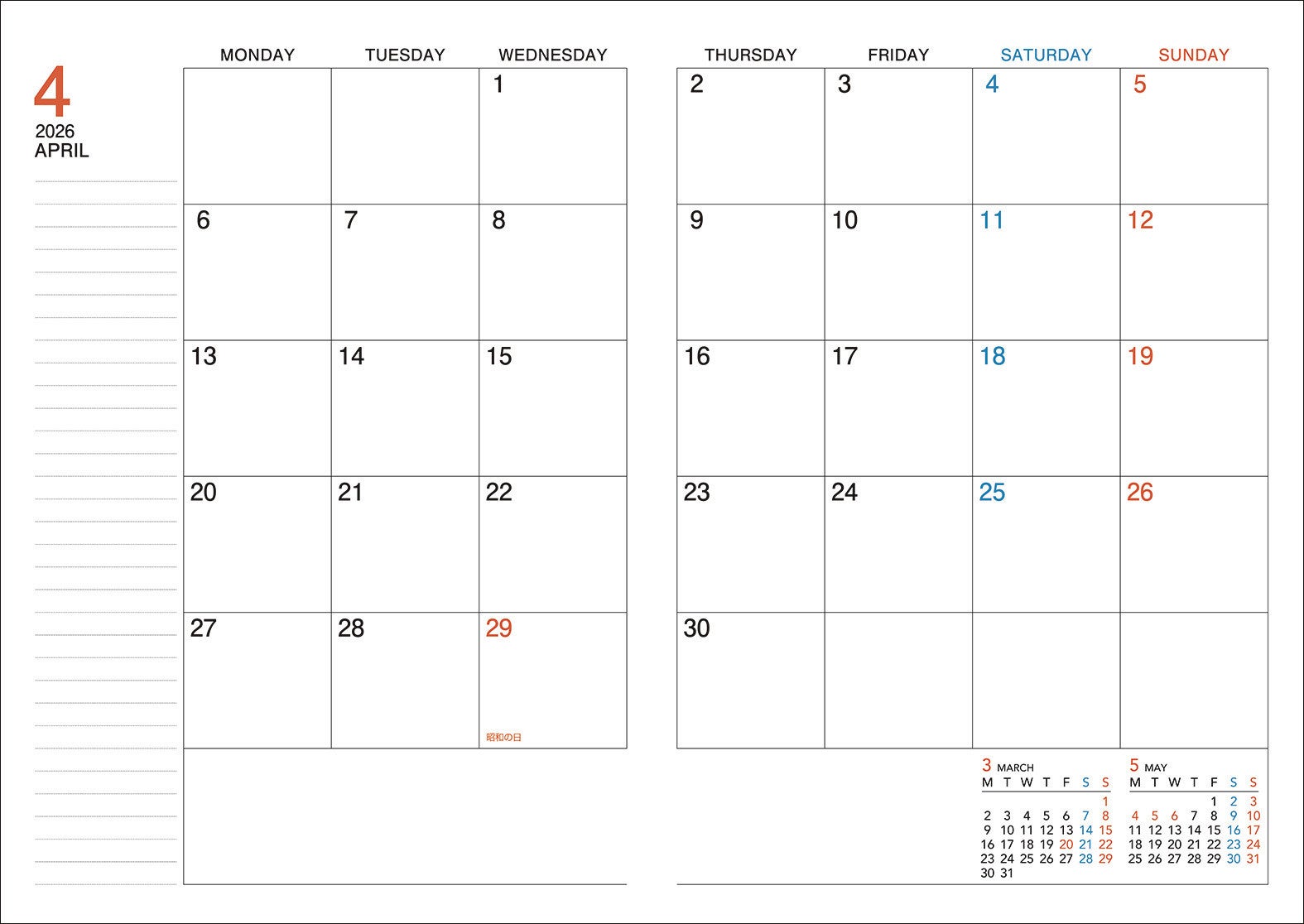 年間カレンダー、月間予定、年度計画表、ノートというシンプルな罫内容で、使う人を選びません。また、64ページと薄型で持ち運びにも便利です。広い記入欄は予定が書き込みやすく、詳細をメモするのにも役立ちます。月曜始まりのため、土日をひとまとまりで書きやすくなっています。