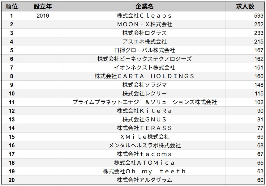 株式会社SalesNow(本社:東京都渋谷区、代表取締役:村岡功規、以下「当社」)は、国内540万社の企業情報を完全網羅した日本最大級のデータベース「SalesNow DB」より、2024年4月1日〜2025年4月1日の期間における求人データ(※アルバイト媒体を除く)をもとに、「2019年設立企業」における求人数ランキングTOP20を集計・発表いたしました。