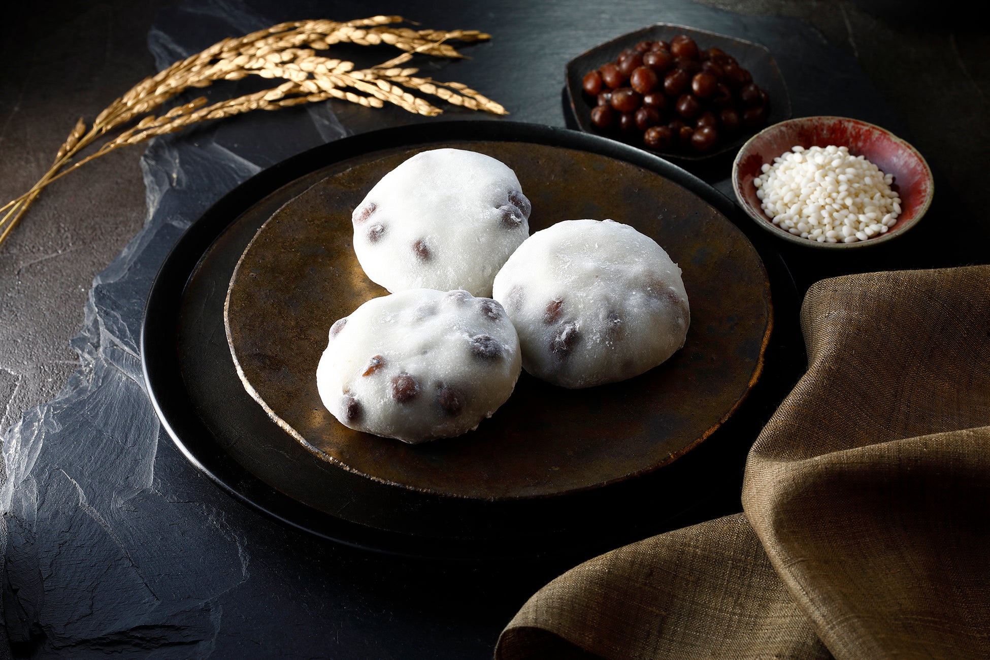 もち米から杵つきでつき上げたこしのある生地に赤えんどう豆を練り込み、粒餡を包んだ大福。