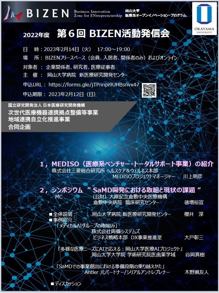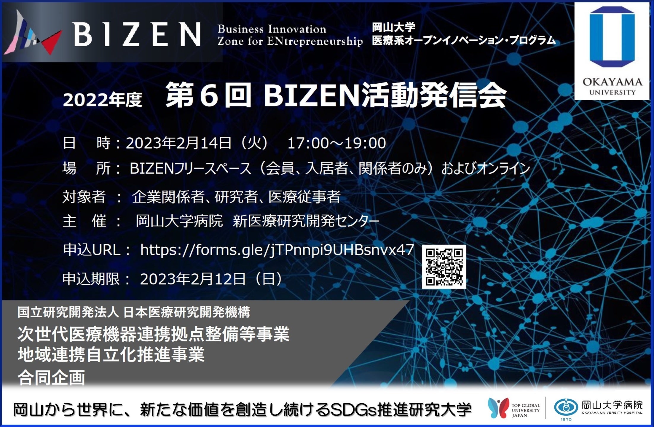 【岡山大学】岡山大学病院 医療系オープンイノベーション・プログラム「第6回BIZEN活動発信会」〔2/14 火,オンライン〕