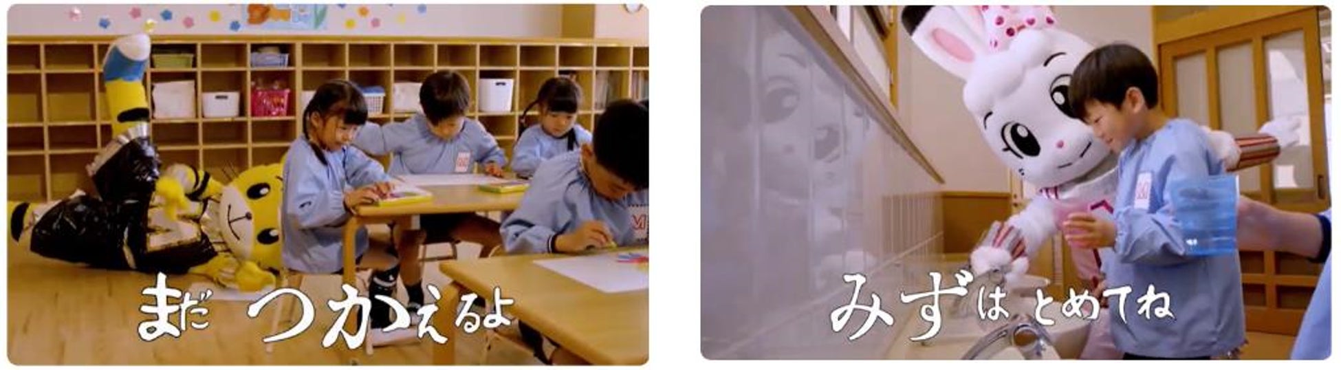 「こどもちゃれんじ」の各キャラクターが子どもたちに「まだ つかえるよ」「みずはとめてね」「むだづかい だめ」「めざせ おさら ぴかぴか のこさず たべよう だってほら」など生活の場面に即した「もったいない」を呼びかけていきます。