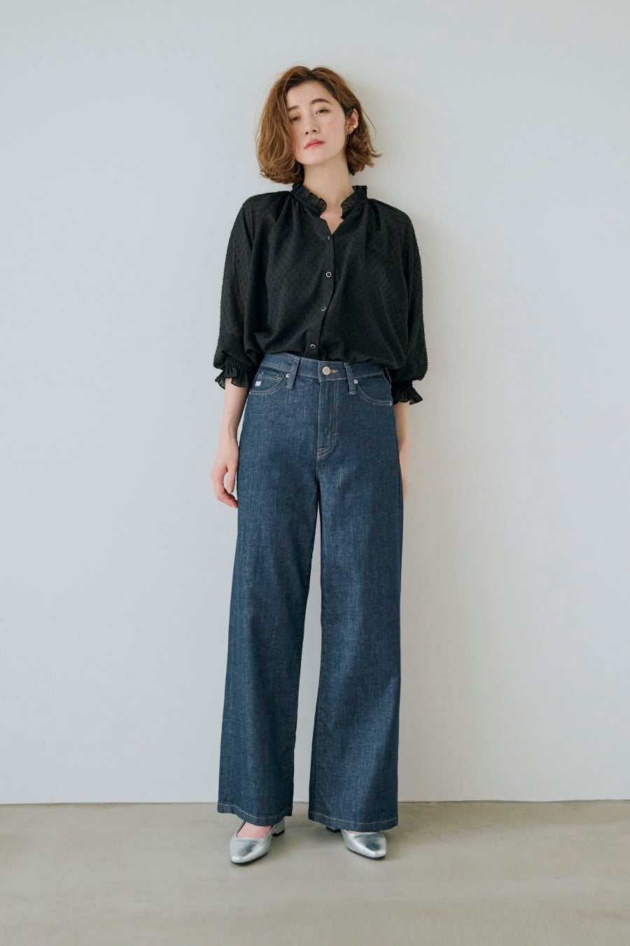 緩やかに広がるフレアシルエットが、レッグラインをカバーしながら脚長に見せてくれ、高めに配置したバックポケットはヒップトップを高く見せてくれるので、スタイルアップ効果も期待できます。
