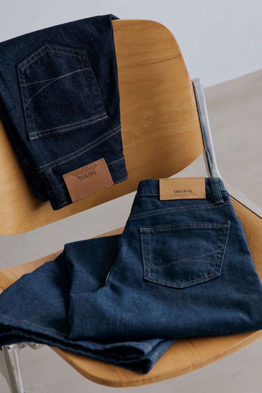 今回はSOMETHINGの人気シリーズ「LISA WIDE」の中から、深みのあるカラーが上品なグレーキャストブルーと、定番のワンウォッシュの2色を別注シルエットで特別オーダー。ステッチのカラーも変更しています。