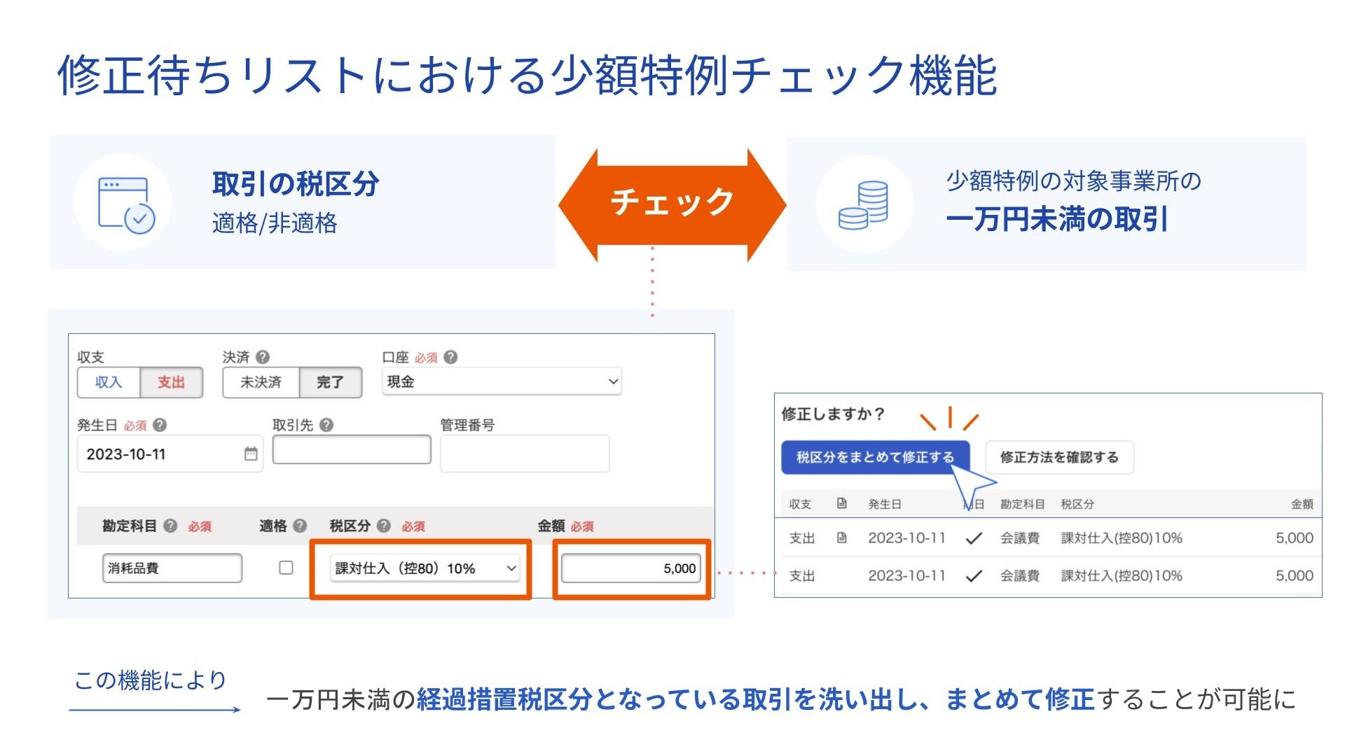 証憑が添付されていない取引に対しても、少額特例(※)に該当する事業所については、10,000円未満の経過措置税区分となっている取引を洗い出し、税区分をまとめて修正することが可能になります。