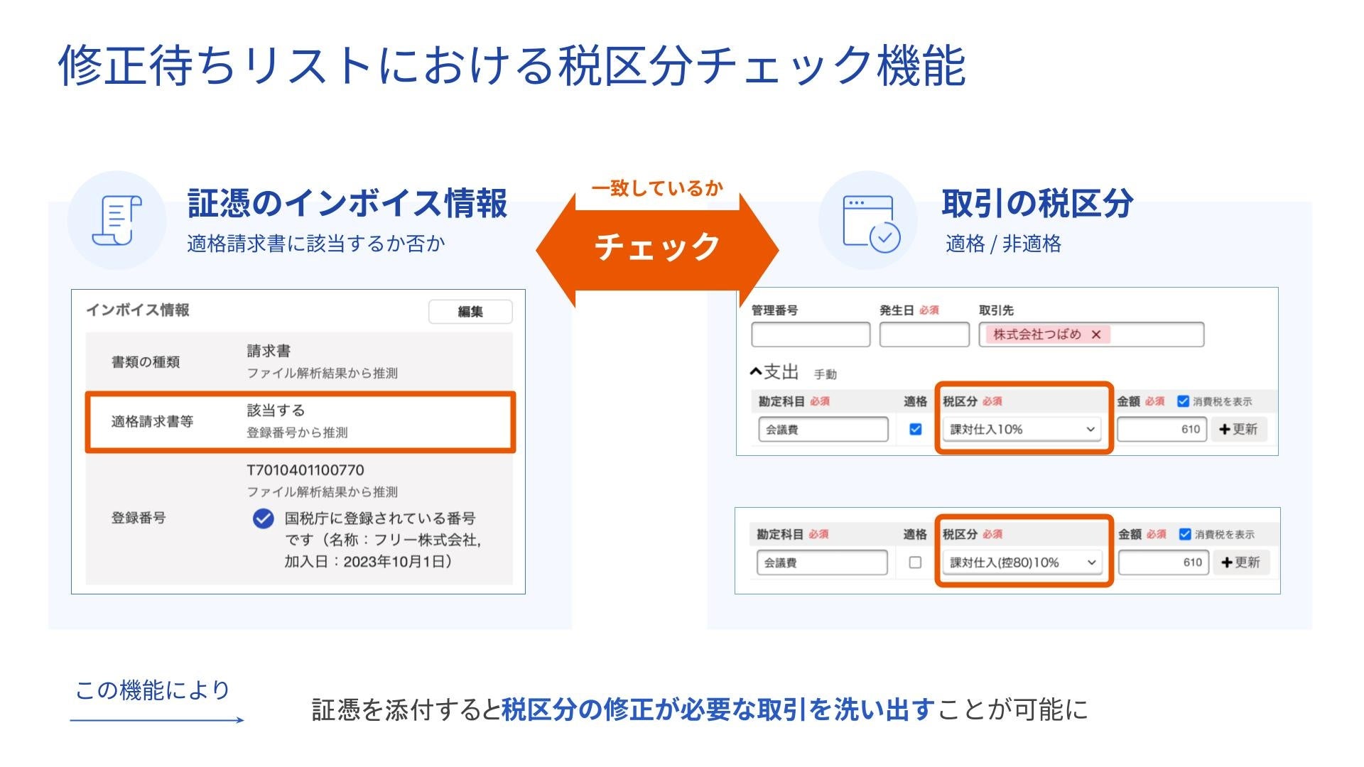 freee株式会社(本社:東京都品川区、CEO:佐々木大輔、以下「freee」)はインボイス制度対応に向けて、証憑添付のマッチングアラート機能・修正待ちリストにおける税区分チェック機能・修正待ちリストにおける少額特例チェック機能などのチェック機能を強化したサービス提供を予定しています。