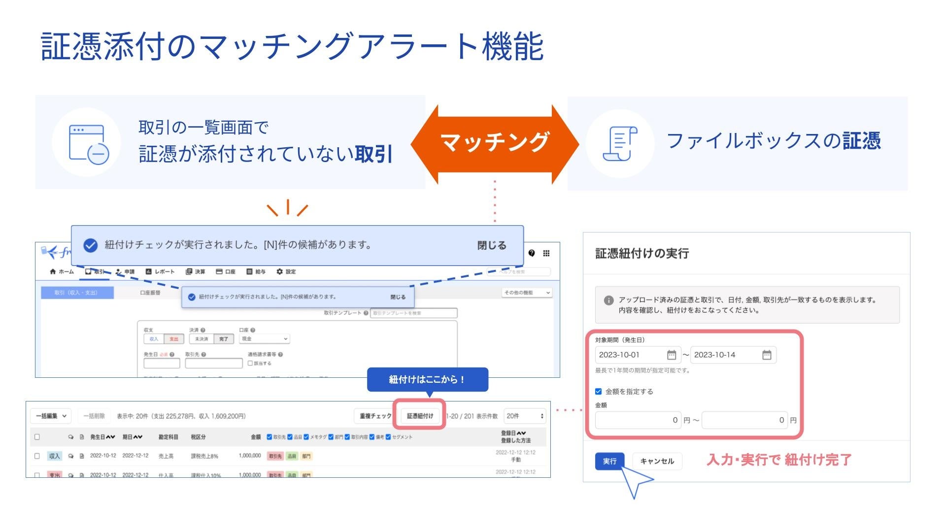 取引の一覧画面で証憑が添付されていない取引と未処理となっているファイルボックスの証憑をマッチングすることができます。この機能により、証憑の保管義務に簡単に対応することが可能です。