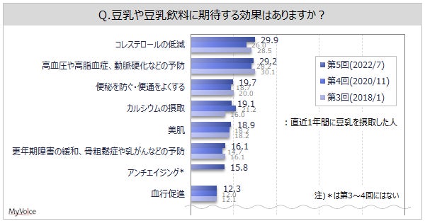 【豆乳に関する調査】豆乳が好きな人は4割弱、女性若年層で比率高い。直近1年間に飲んだ人は5割弱。期待する効果は「コレステロールの低減」が直近1年間摂取者の3割