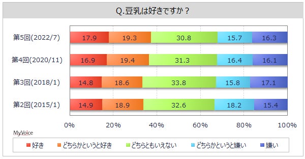 マイボイスコム株式会社(東京都千代田区、代表取締役社長:高井和久)は、5回目となる『豆乳』に関するインターネット調査を2022年7月1日~5日に実施しました。調査結果をお知らせします。