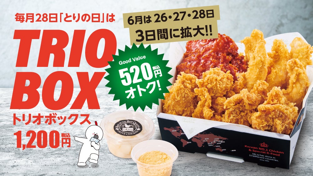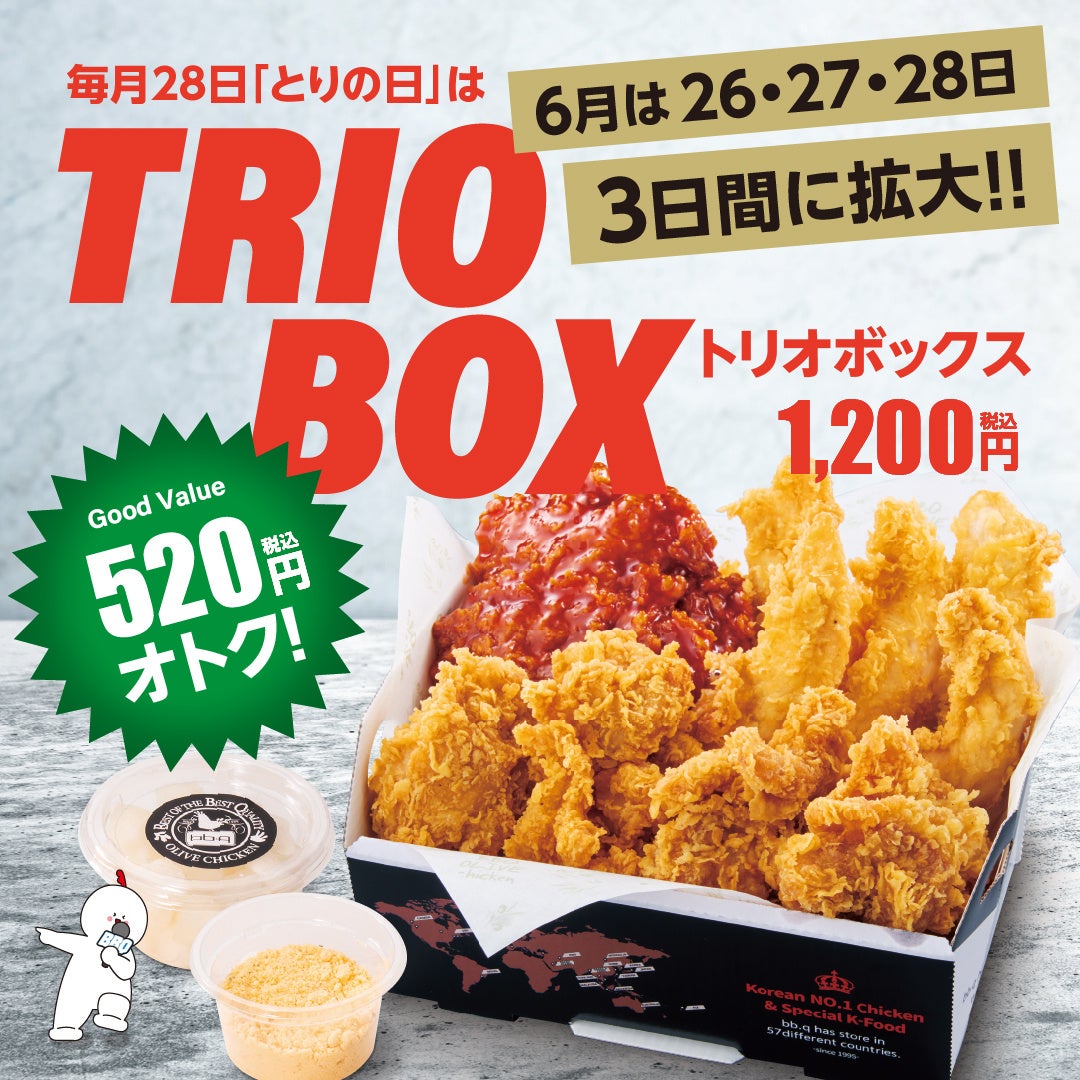 【韓国No.1フライドチキンブランド bb.q オリーブチキン】毎月28日「とりの日」限定トリオボックスが究極リニューアル!超!ボリュームアップして積み上げ価格から520円オトク!