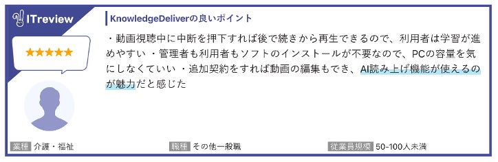 教材登録や動画視聴の利便性が高く、柔軟な設定機能や学習進捗をサポートする機能が、多くのお客さまから高い評価をいただいております。業務効率化や管理者の負担軽減につながる点も好評で、特にシンプルな操作性やAI読み上げ機能などの付加価値が魅力としてコメントをいただきました。