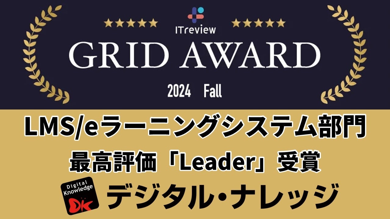 導入実績3000超を誇るeラーニング専門ソリューション企業、株式会社デジタル・ナレッジ(本社:東京都台東区、代表取締役社長:はが弘明)は、国内最大級のIT製品・SaaSレビューサイト「ITreview」が発表する 「ITreview Grid Award 2024 Fall LMS/eラーニングシステム部門」において、eラーニングシステムの決定版『KnowledgeDeliver(ナレッジデリバー)』が最高評価の「Leader」を受賞したことをお知らせします。