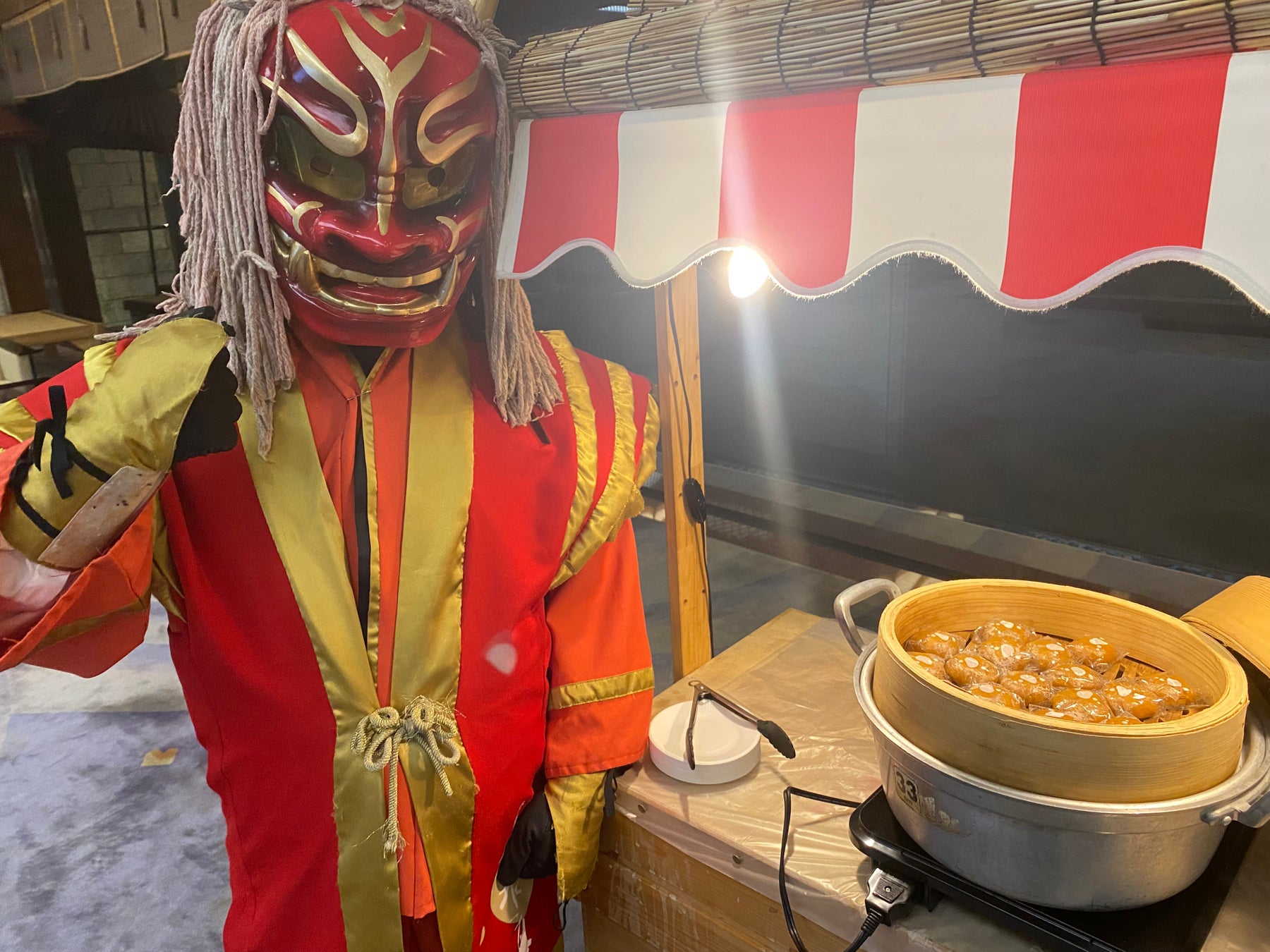 登別石水亭では9月から11月の毎週土日限定で、ロビーにて湯鬼神がウェルカム饅頭を提供致します。