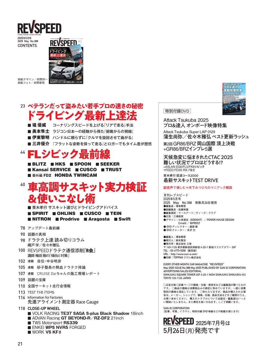 レブスピード5月号発売!誌面巻頭特集『若手プロに聞くドライビング最新上達法』。付録DVDは『アタック筑波 2025オンボード映像集』他、5本・総尺120分でドラテク&チューニングの学べる映像がズラリ!