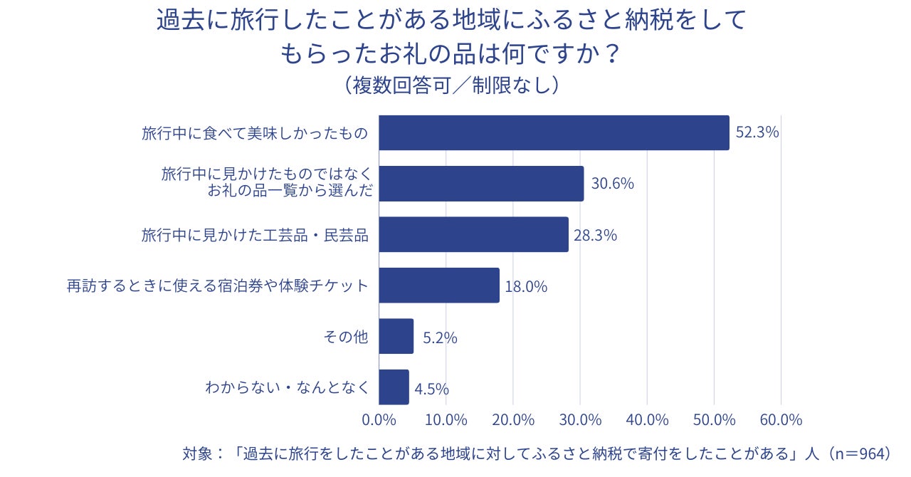 過去に旅行をしたことがある地域に対して、ふるさと納税で寄付したことがある人の割合は半数以上に上り、その理由として最も多かった回答は「旅先の地域を好きになり応援したくなったから」でした。旅行をして芽生えたその地域への想いの受け皿として、地域に貢献できるふるさと納税が選ばれ、地域との継続的な関係作りに役立っていることがわかります。また約4割の人が、過去のふるさと納税がきっかけで、その地域に実際に旅行したことがあると回答しています。「お礼の品でもらった食べ物を現地で味わいたかったから」が最も多い理由であったことからも、ふるさと納税は、食べ物をはじめとしたお礼の品を通じて、その地域の魅力を知るきっかけのひとつとなっており、実際に現地に足を運ぶ原動力になっていると言えます。