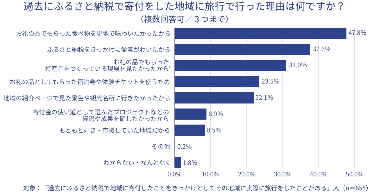 ◆ 過去にふるさと納税で寄付したことがきっかけで、その地域に実際に旅行したことがある人の割合は38.9%。最も多い理由は「お礼の品でもらった食べ物を現地で味わいたかったから」が47.8%、「ふるさと納税をきっかけに愛着がわいたから」が37.6%。