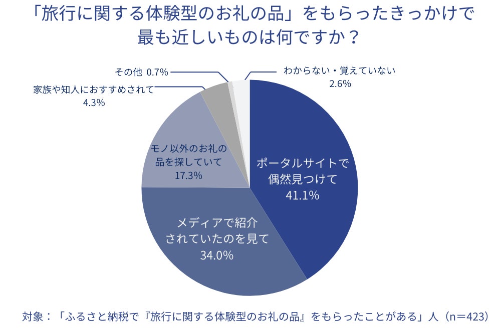 ◆ 国内旅行をする際に使える「旅行に関する体験型のお礼の品」をもらったことがある人の割合は25.1%。もらったことはないが、関心がある人の割合は39.9%。「旅行に関する体験型のお礼の品」をもらったきっかけで一番多かったのは「ポータルサイトで偶然見つけて」で41.1%、次に「メディアで紹介されていたのを見て」で34.0%。