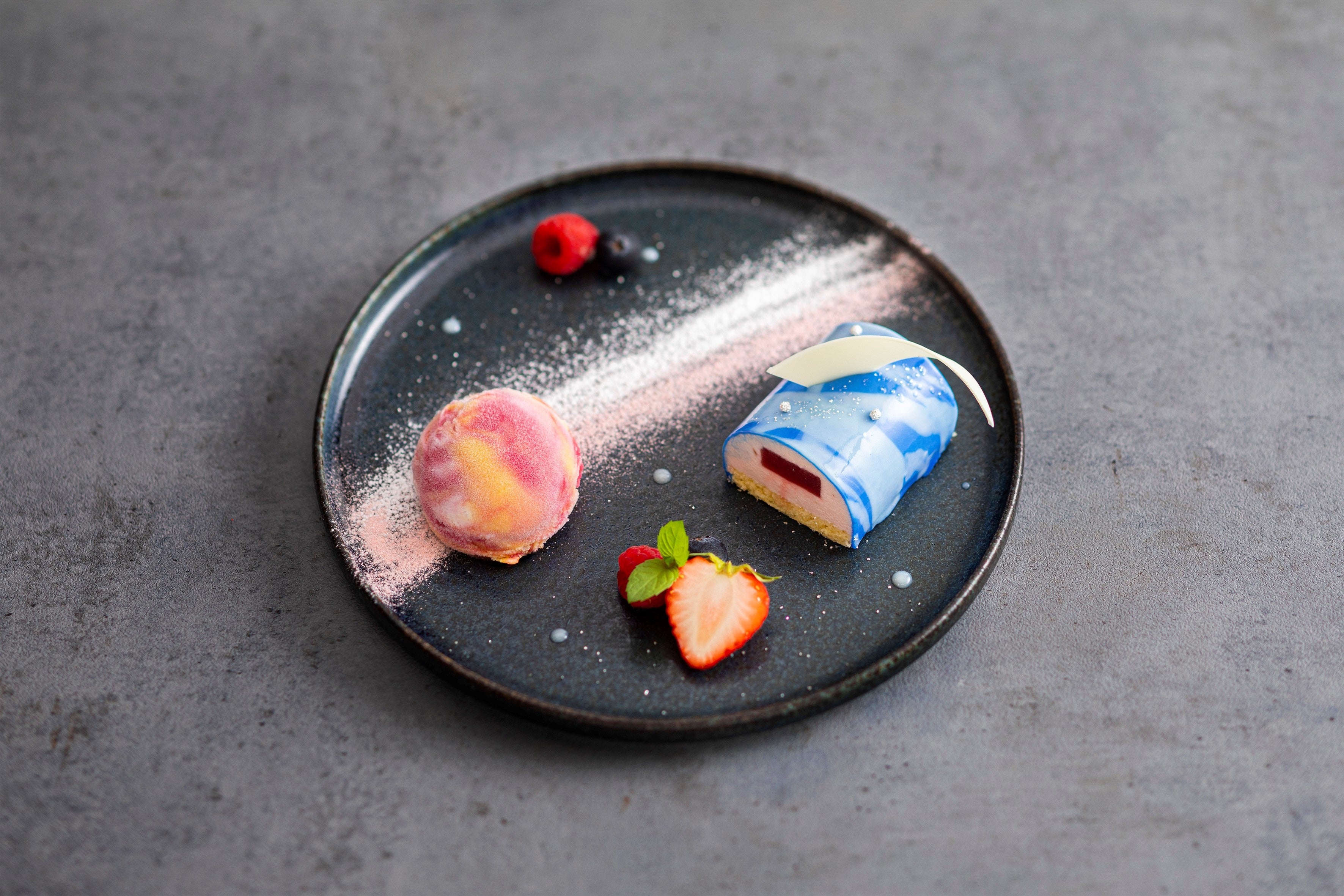 いちごのフロマージュムースに惑星のアイスを盛り付け、1皿で星空をイメージしました。
