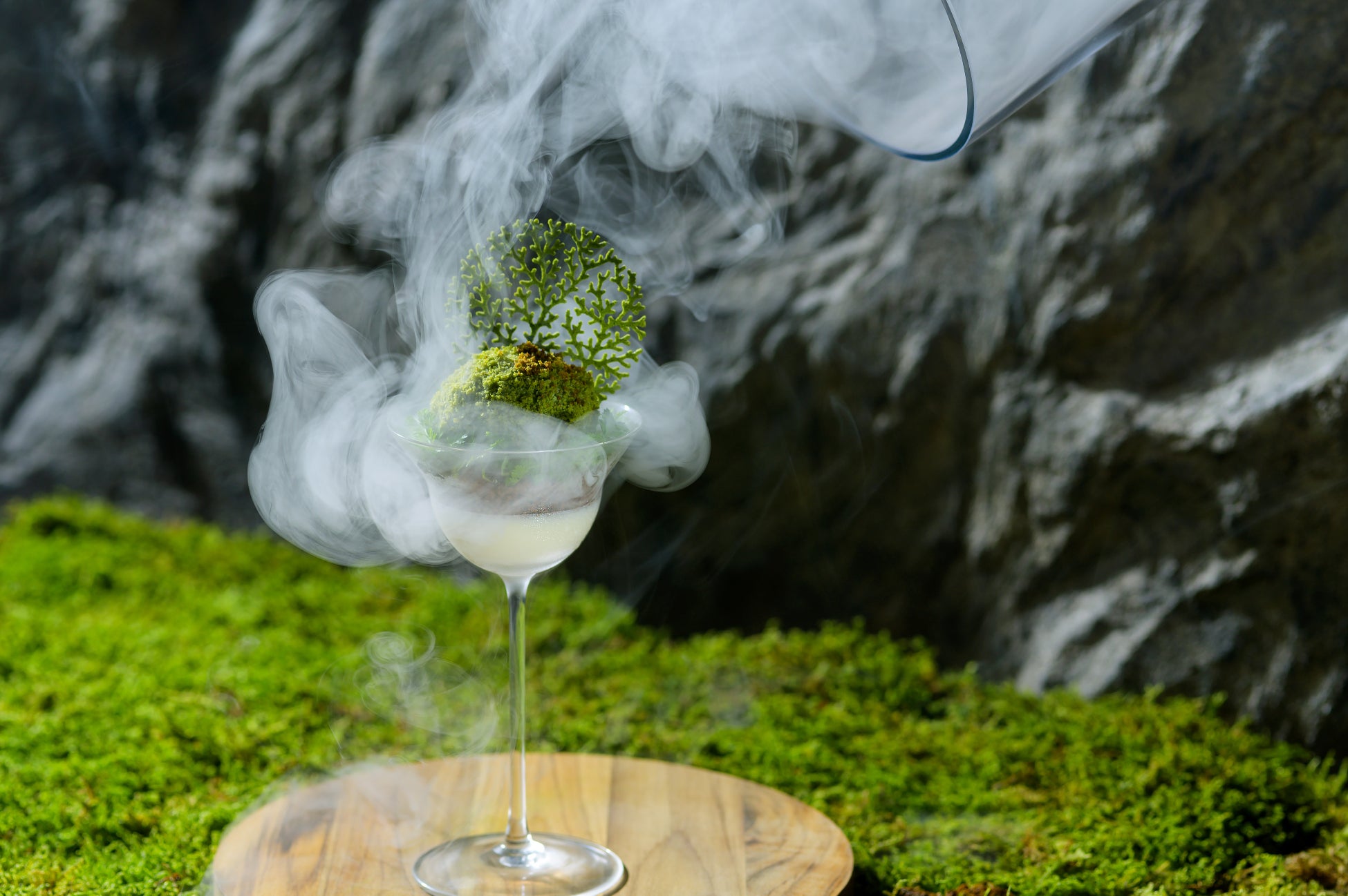 苔の生育環境にとって、ヤマセが湖や谷にたまり、湿度の高い状態が保たれることが非常に重要です。そのため、ヤマセが発生する夏の時期の苔は、1年の中で最も潤い、生き生きと輝きます。パフェをただ味わうだけでなく、夏の苔の生息環境を楽しんでほしいと思い、幻想的なスモークを用いて奥入瀬渓流の湿潤な環境を表現しました。夏の苔の生育環境を知り、苔をイメージしたパフェを味わうことで、この時期ならではの苔の魅力を存分に楽しめます。