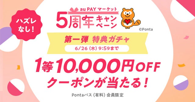 au PAY マーケット、5周年を記念したキャンペーンを開催【Pontaパス会員限定】 50%割引クーポンや最大1万円があたるガチャなど実施