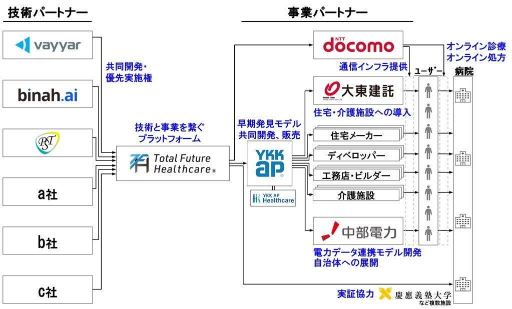 YKK AP株式会社(以下、YKK AP)、大東建託株式会社(以下、大東建託)、株式会社NTTドコモ・ベンチャーズ*1(ドコモグループ)、中部電力株式会社(以下、中部電力)は、イーソリューションズ株式会社(以下、イーソリューションズ)子会社のトータルフューチャーヘルスケア株式会社(以下、TFH)への出資を通じ、生活空間で発生する転倒等の急変や、認知症等の疾患リスクの早期発見モデルの社会実装に取り組む業界横断のプラットフォームを発足します。