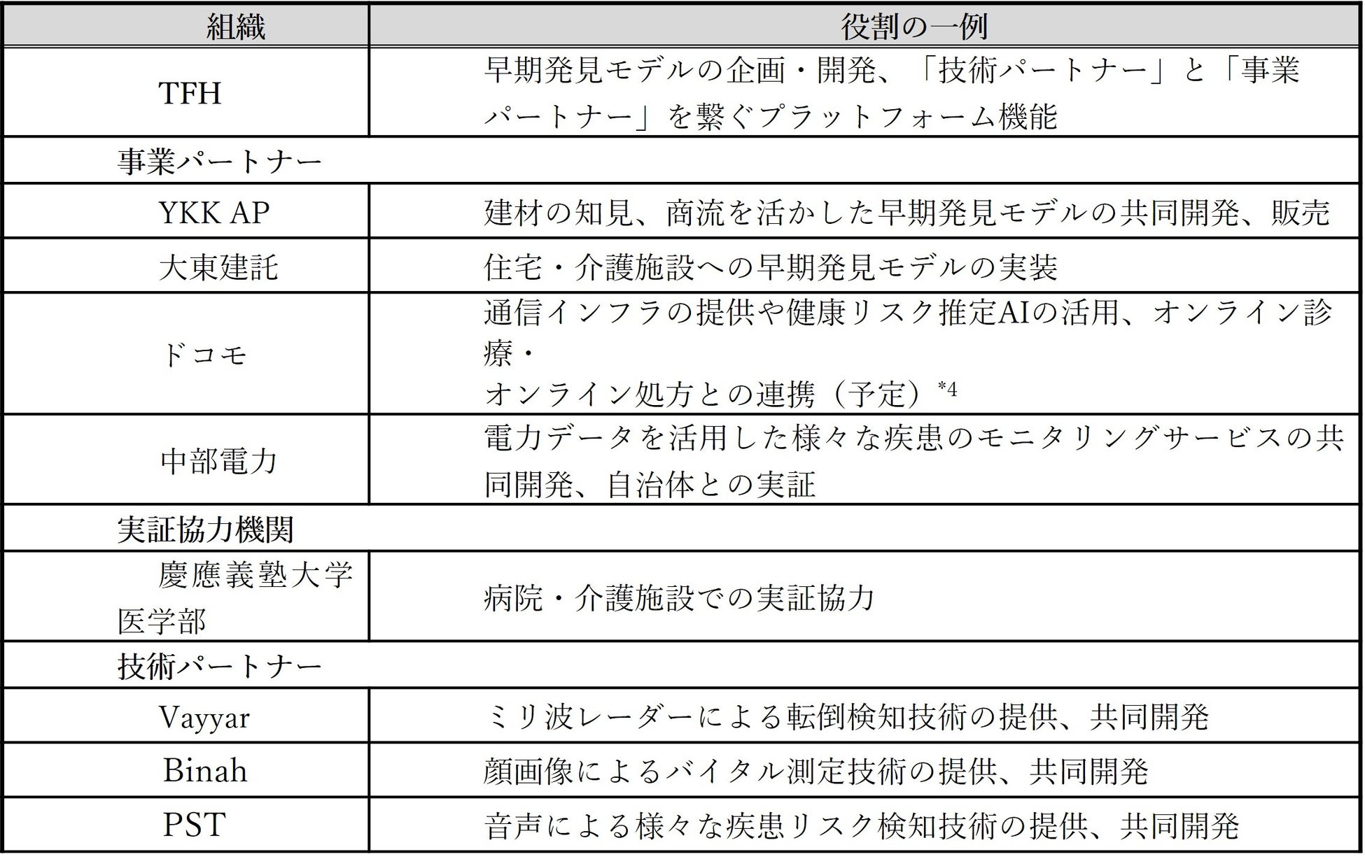 世界最先端技術を有する「技術パートナー」と、エンドユーザーへサービスを提供する「事業パートナー」を繋ぐプラットフォームの役割をTFHが担い、参画する各組織が自社の強みや既存事業を活かした役割のもと、「急変の早期発見」「軽症での早期発見」モデルの生活空間への社会実装を目指します。