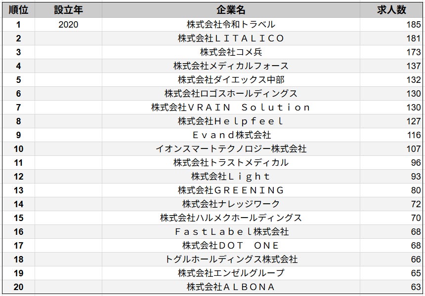 株式会社SalesNow(本社:東京都渋谷区、代表取締役:村岡功規、以下「当社」)は、国内540万社の企業情報を完全網羅した日本最大級のデータベース「SalesNow DB」より、2024年4月1日〜2025年4月1日の期間における求人データ(※アルバイト媒体を除く)をもとに、「2020年設立企業」における求人数ランキングTOP20を集計・発表いたしました。