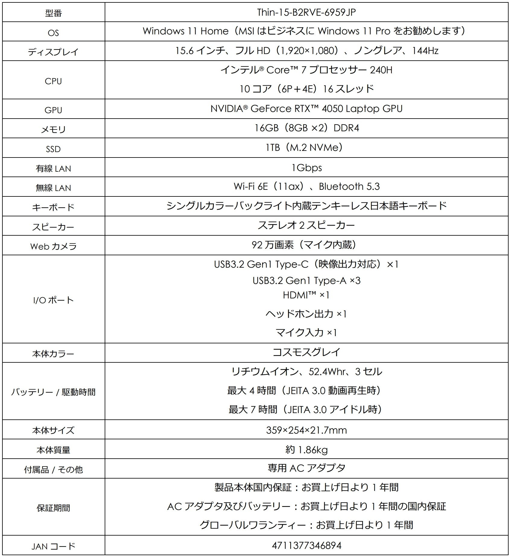 【Thin-15-B2RVE-6959JPの主な特徴】