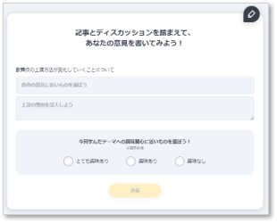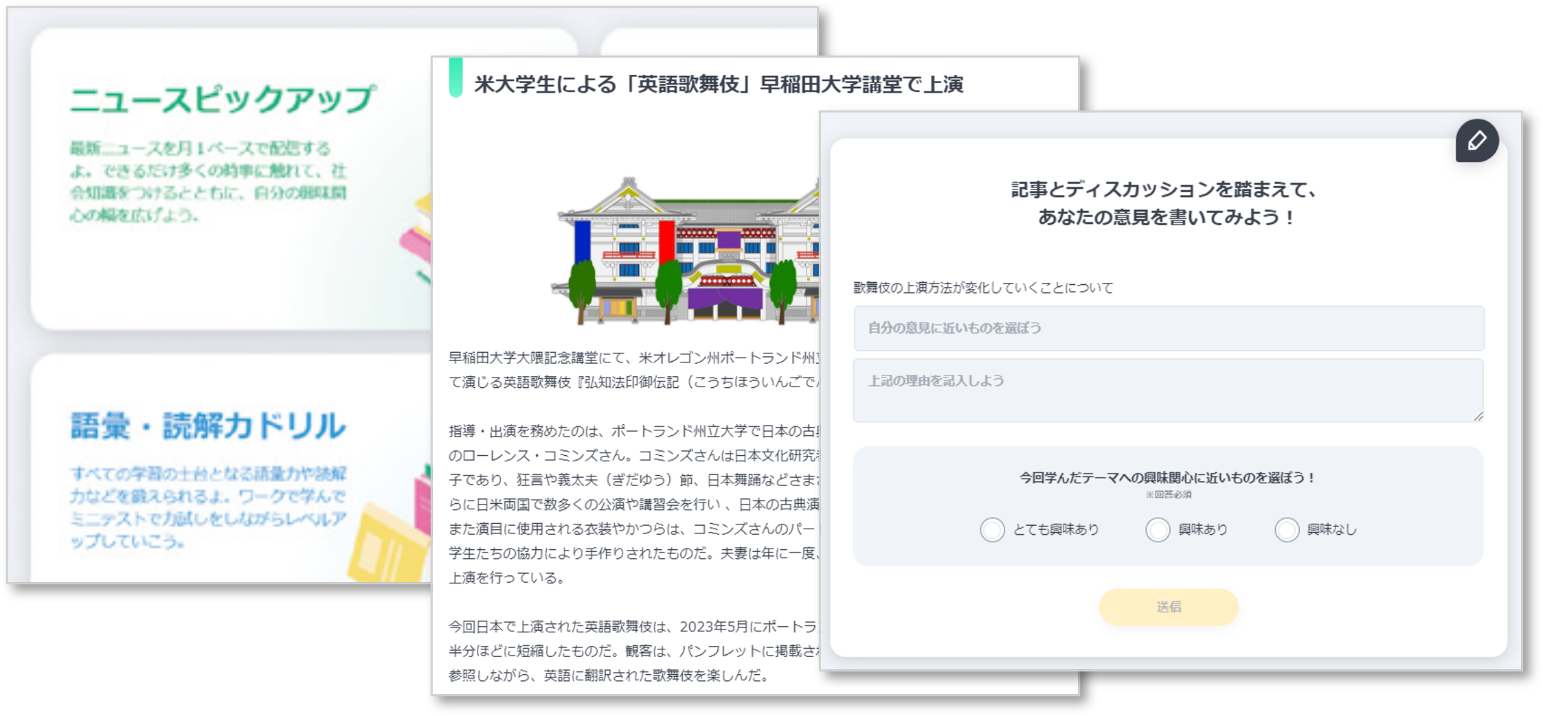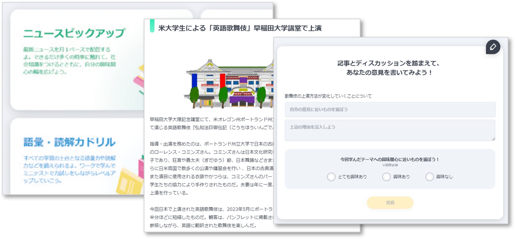 ▲画像:左からトップ画面、教材の事例(素材、意見記述の画面)