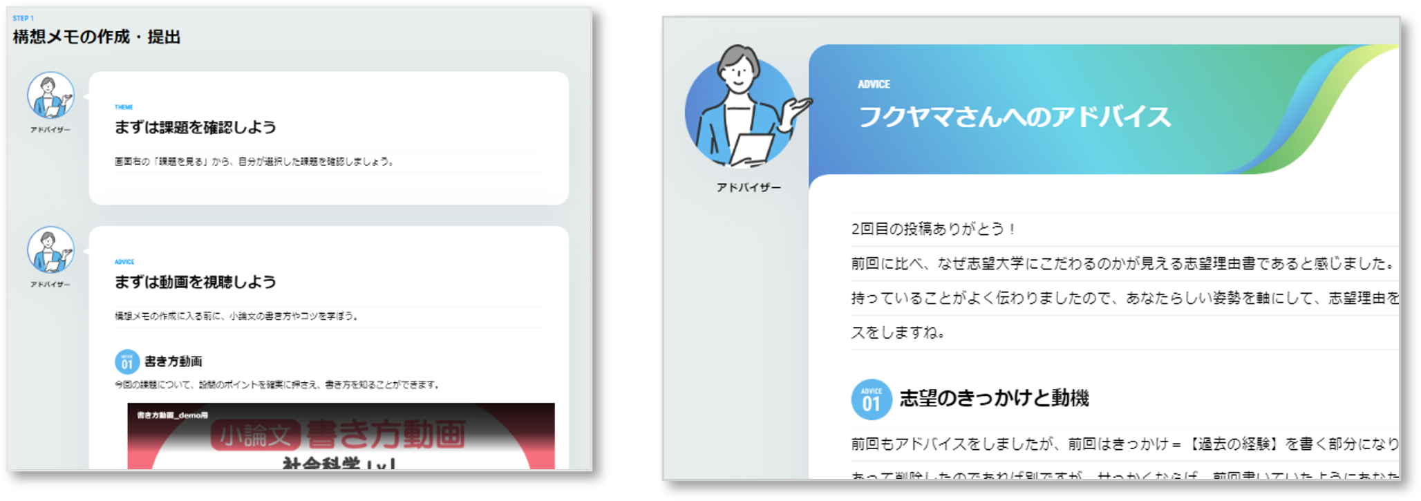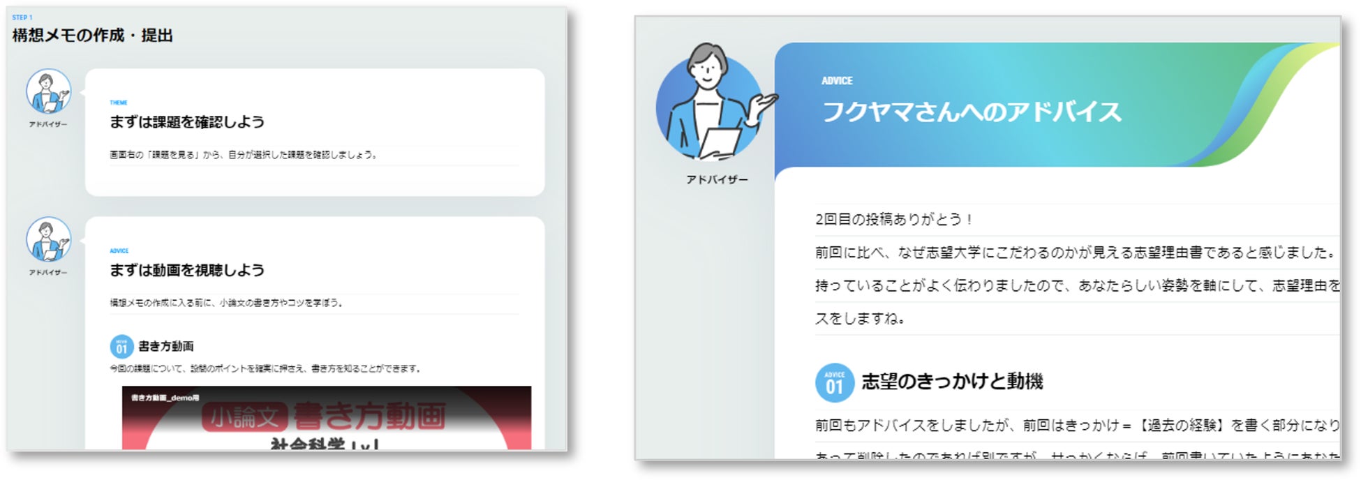 ▲画像:左から小論文ネタ動画、構想メモ作成ナビ画面