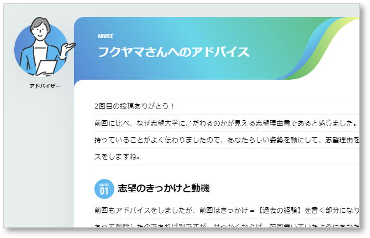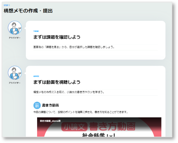 「小論文・志望理由書ナビ」では、構想メモと文章の2段階のステップアップ添削を行います。構想メモへの添削アドバイスを踏まえながら文章を書くことで、よい小論文・志望理由書を書き上げる力が身につきます。