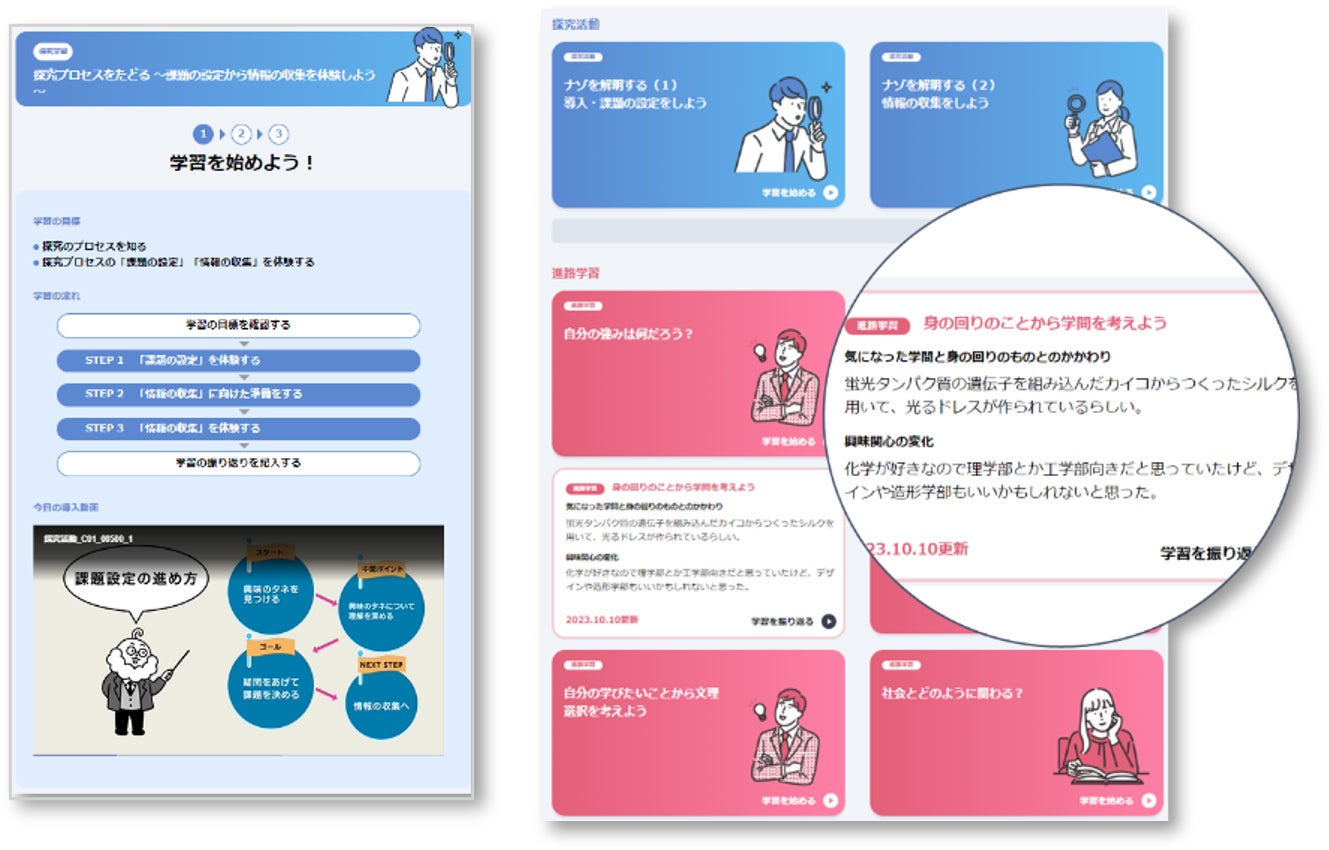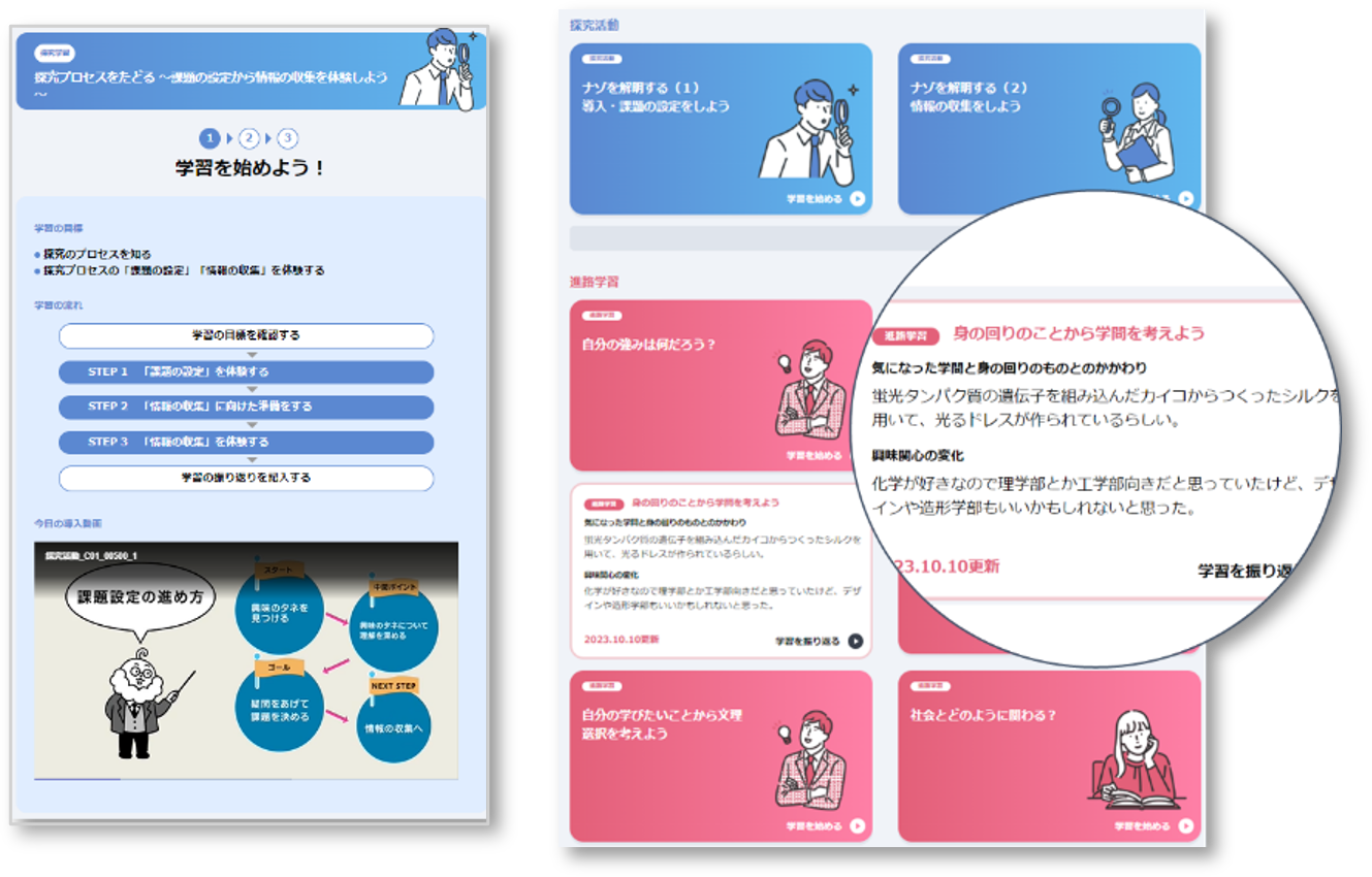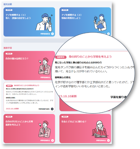 すべての授業に振り返りパートがあり、生徒が「今の自分の興味の関心の変化」を記載、蓄積するため、進路を考える際の自分の軸に気付くことができます。