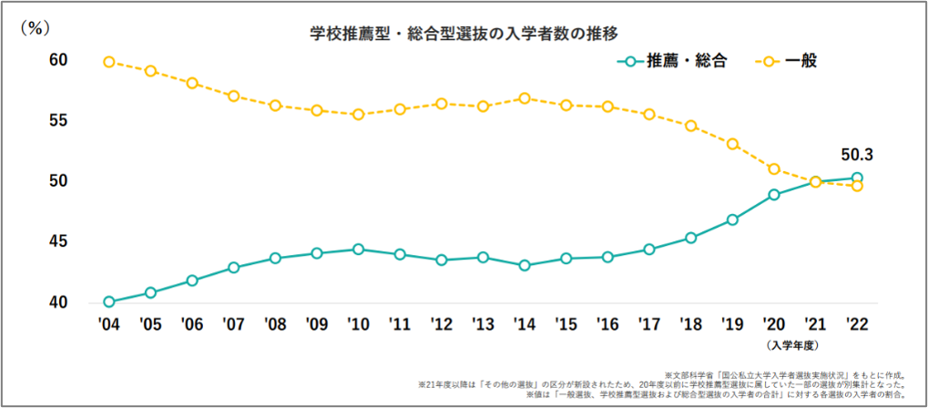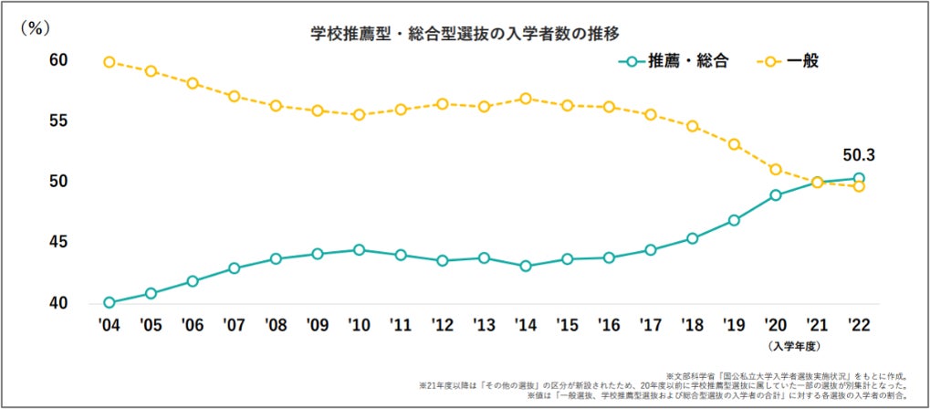 年内入試で大学へ入学した学生の割合は2022年度に50.3%となり一般入試と比率を上回りました。2024年度入試でも学校推薦型・総合型選抜を拡大する大学が増加します。