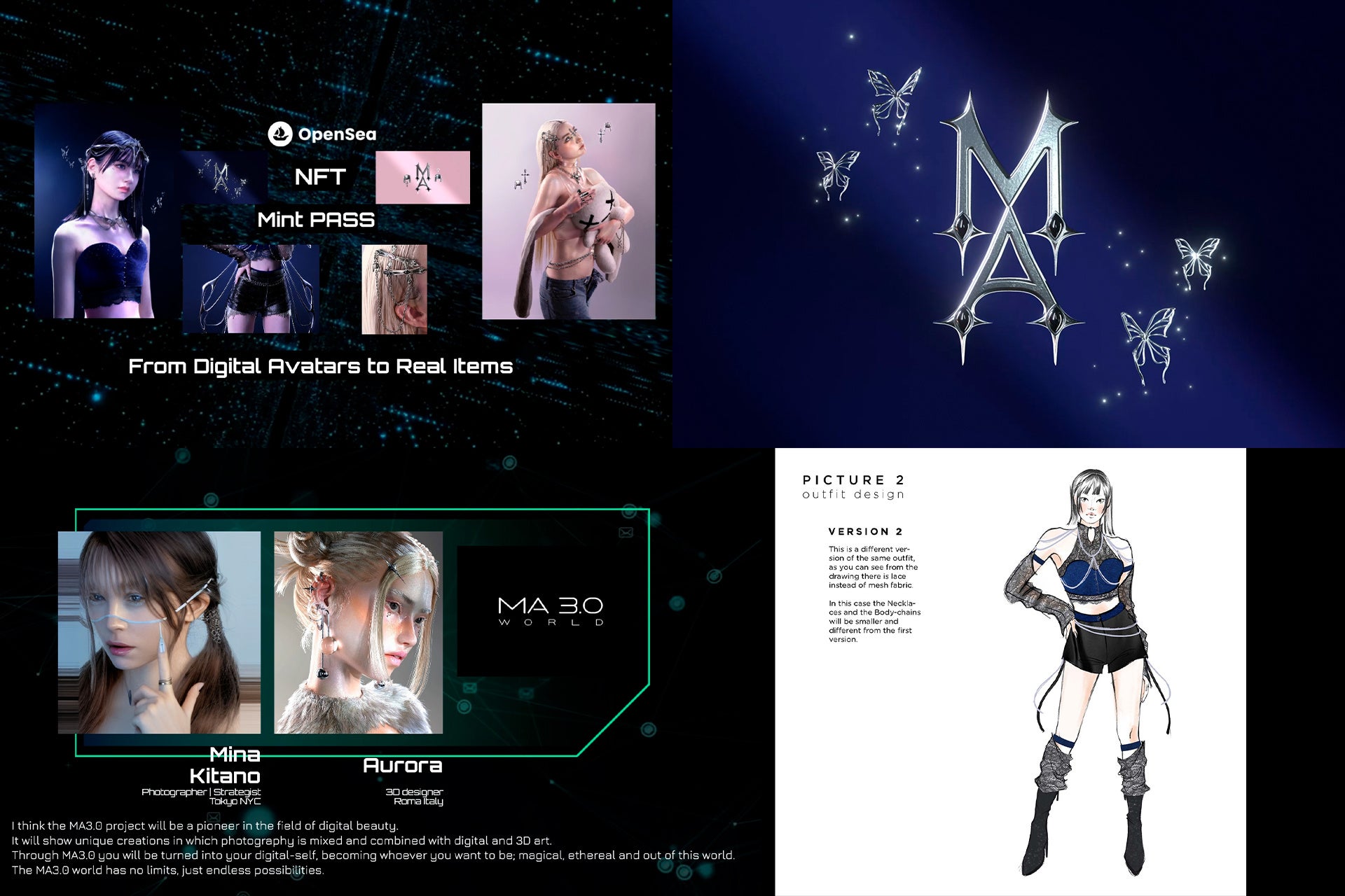 MA3.0(エムエースリー / https://ma3.world/ )とは、web3.0サービスで世界中の女性の活躍を応援する、デジタルビューティーDAO(分散型自立組織)です。「美少女図鑑AWARD 2023」や「美少女図鑑COLLECTION2023 SPRING/SUMMER」 のキービジュアル撮影を担当した写真家・北野美奈(きたのみな)と、イタリア・ローマ在住の3Dデザイナー・オーロラを中心とした女性のクリエイター、エンジニアのチームです。国を越えたクリエイターとアバターになる本人がなりたい自分やアイテム、機能などを決めてデジタルビューティーアバターを制作します。アバターは本人の分身として世界のアーティストやエンジニアや企業と最新のコラボレーションで活動します。さらにNFTの活用により、コミュニティメンバーへの参加、作品やアバターの所有、コラボアイテム交換など、リアルとデジタルのハイブリッドにより多様な取り組みを実現します。