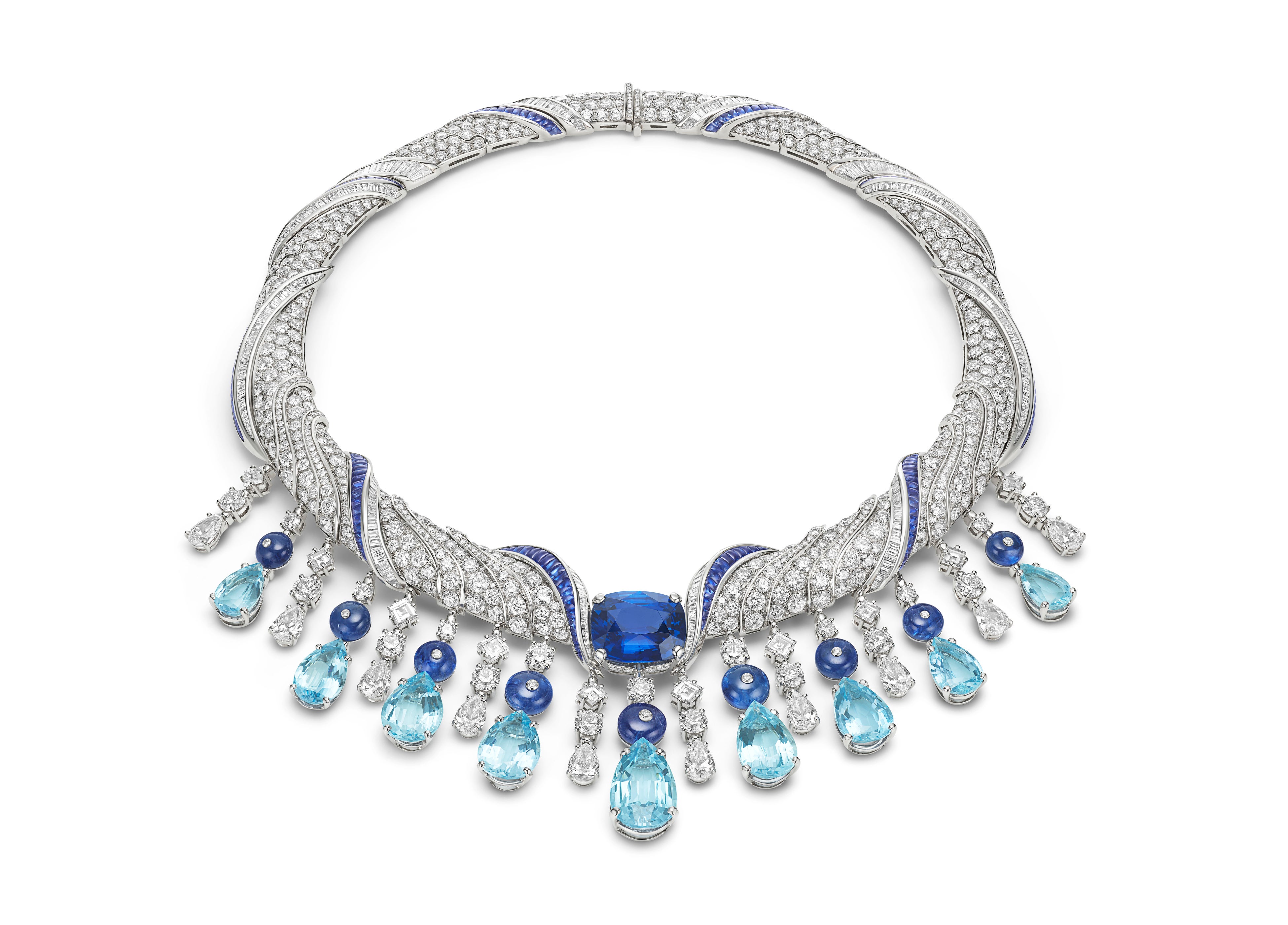のどかな白亜のバロック建築の街並みが海を見渡す南イタリアのアプリア地方をイメージした、「Southern Sapphire(サウザーン サファイア)」と名付けられたプラチナネックレスは、レースのように緻密に編まれた軽やかでやわらかな煌めくダイヤモンドと透明なサファイアの連なりが、地中海の青い深みを思わせる66.88カラットもある見事なセイロンサファイアを中心に広がっています。この鮮やかに輝くタイムレスなクリエイションは完成まで1650時間を要し、心を虜にするバランスのとれたエレガンスと極上の完璧さがにじみ出ています。