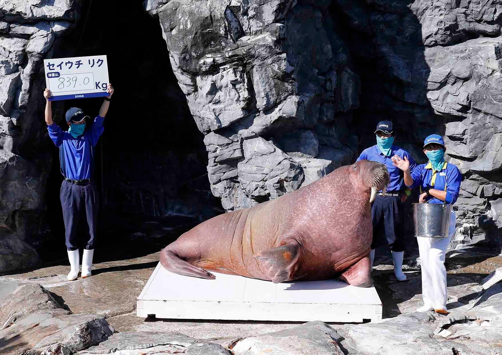 大型海獣類の体重は、いくつかに分割された測定器の上に丈夫な板を乗せた特製の体重計で計測します。シャチのラビー(メス・24歳)はトレーナーのサインで自ら体重計に上がり、セイウチのリク(オス・9歳)は飼育員が誘導し、ゆっくりと体重計に乗りました。かつては体重測定のためにプールの水を抜き、動物をクレーンで釣り上げるなど大掛かりな作業を閉館後に行っていましたが、トレーニングにより動物が自ら体重計に乗れるようになった現在では動物にも飼育員にも負担が少ない体重測定が行えるようになりました。