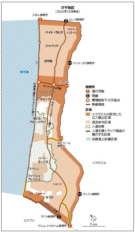 ・ガザ域内ではギャングが跋扈している。2024年11月17日には国連の支援物資を積んだトラック109台のうち99台が、2025年1月4日には75台のうち50台が略奪された。