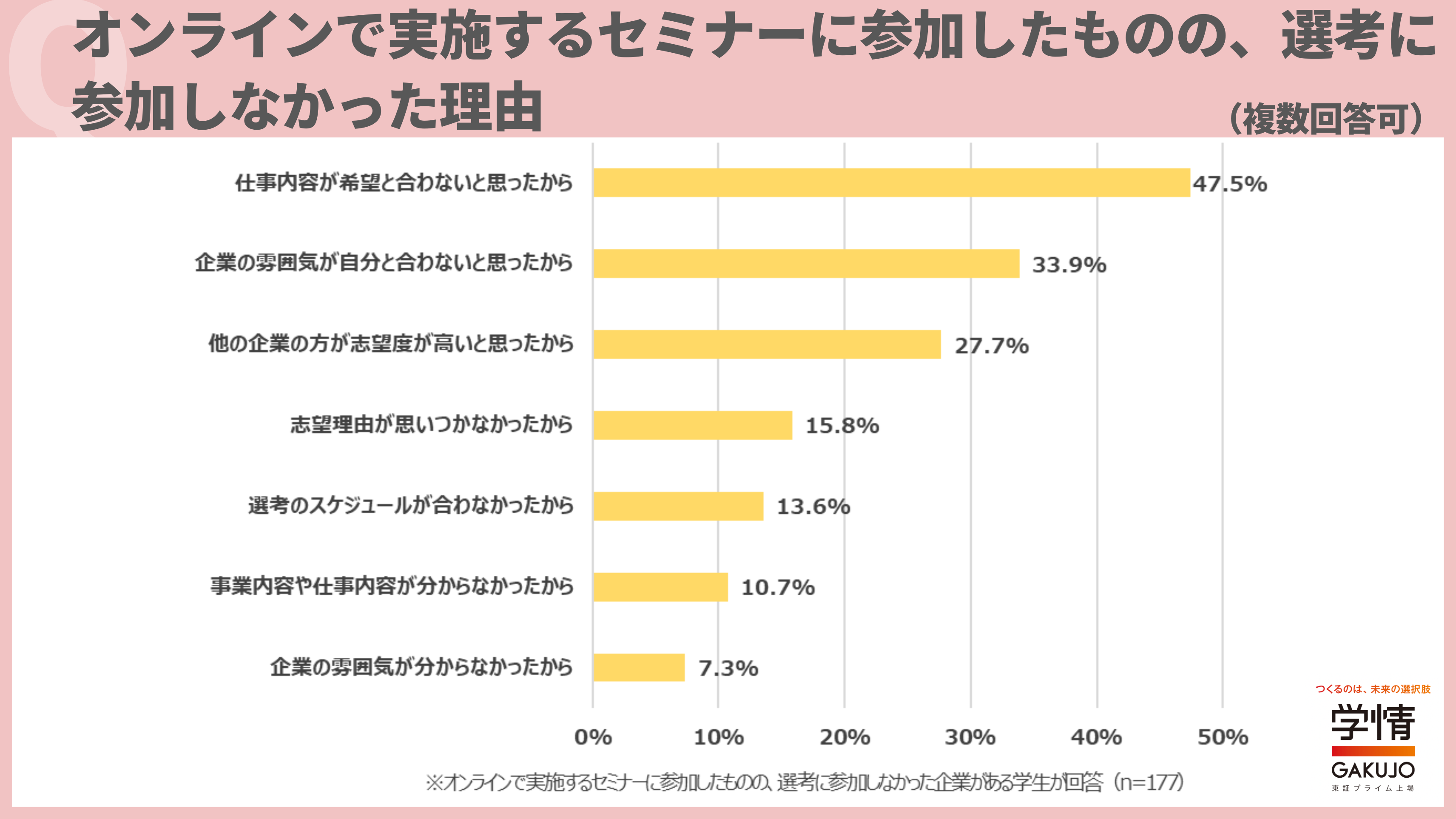 オンラインで実施するセミナーに参加後、選考に進まなかった理由は、「仕事内容が希望と合わないと思ったから」が47.5%で最多。次いで、「企業の雰囲気が自分と合わないと思ったから」33.9%、「他の企業の方が志望度が高いと思ったから」27.7%が続きました。