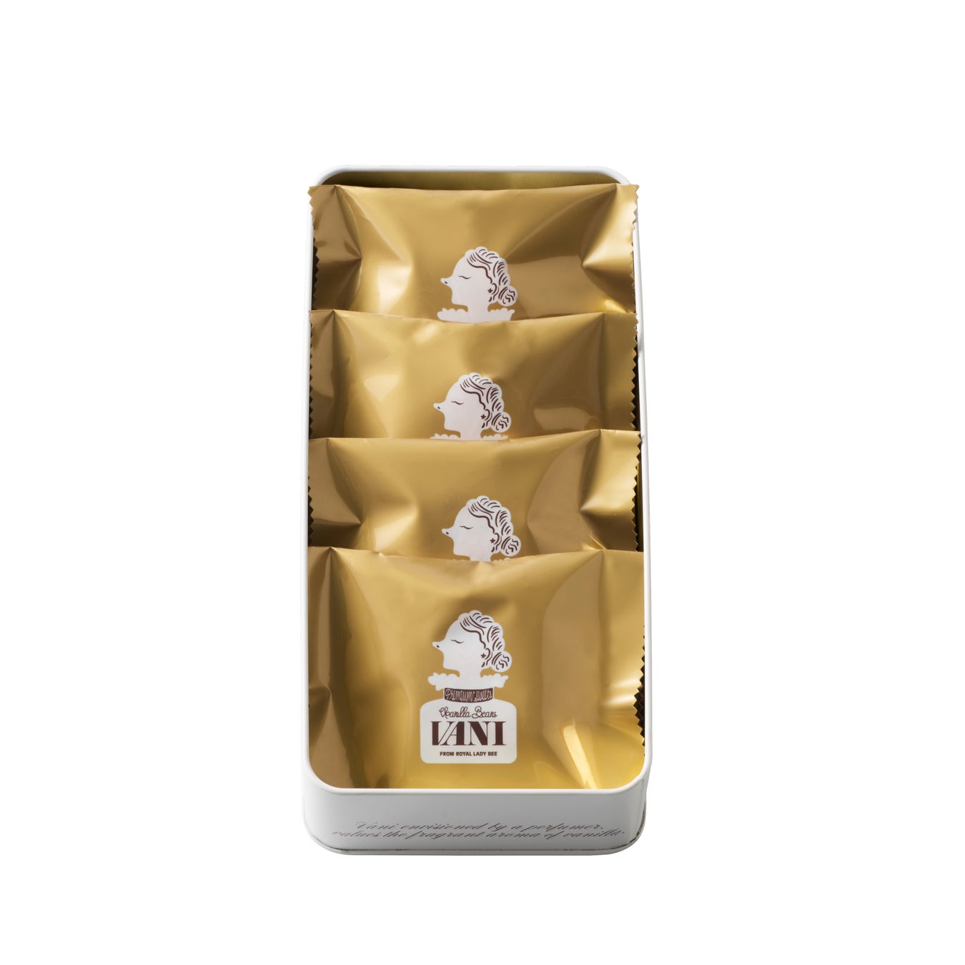 バニラの多彩な魅力を4種類のクッキーで表現しました。オリジナルデザインの四角い缶に入った、数量限定のクッキー缶です。