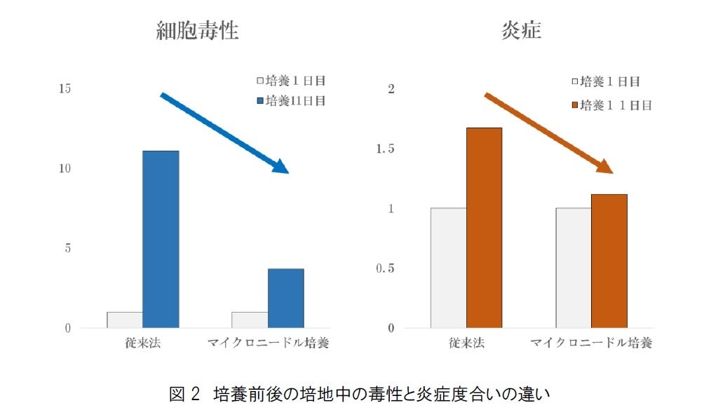 通常の培養方法とマイクロニードルを用いた培養方法による摘出皮膚の培養状態の違いを知るために、それぞれ11日間培養し、細胞毒性と炎症状態*4を評価しました。その結果、通常の培養方法は、培地中の細胞毒性および炎症の指標が、摘出後に比べて大きく増加したのに対し、マイクロニードルの培養方法は、培地中の細胞毒性および炎症の指標が抑えられていました(図2)。