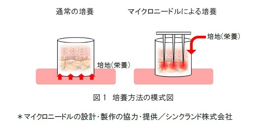 ヒト皮膚を摘出時と同じ状態に保てるよう、摘出皮膚の長期培養方法を検討しました。通常の培養方法は、皮膚の深部から培地を吸い上げる方法(図1/左)で行います。しかし、この方法では摘出皮膚の内部に栄養などが届かず、壊死してしまうという課題がありました。そこで、摘出皮膚の内部に栄養などが届くように、摘出皮膚の上からマイクロニードルを刺して皮膚内部に栄養を届ける方法(図1/右)を考案しました。