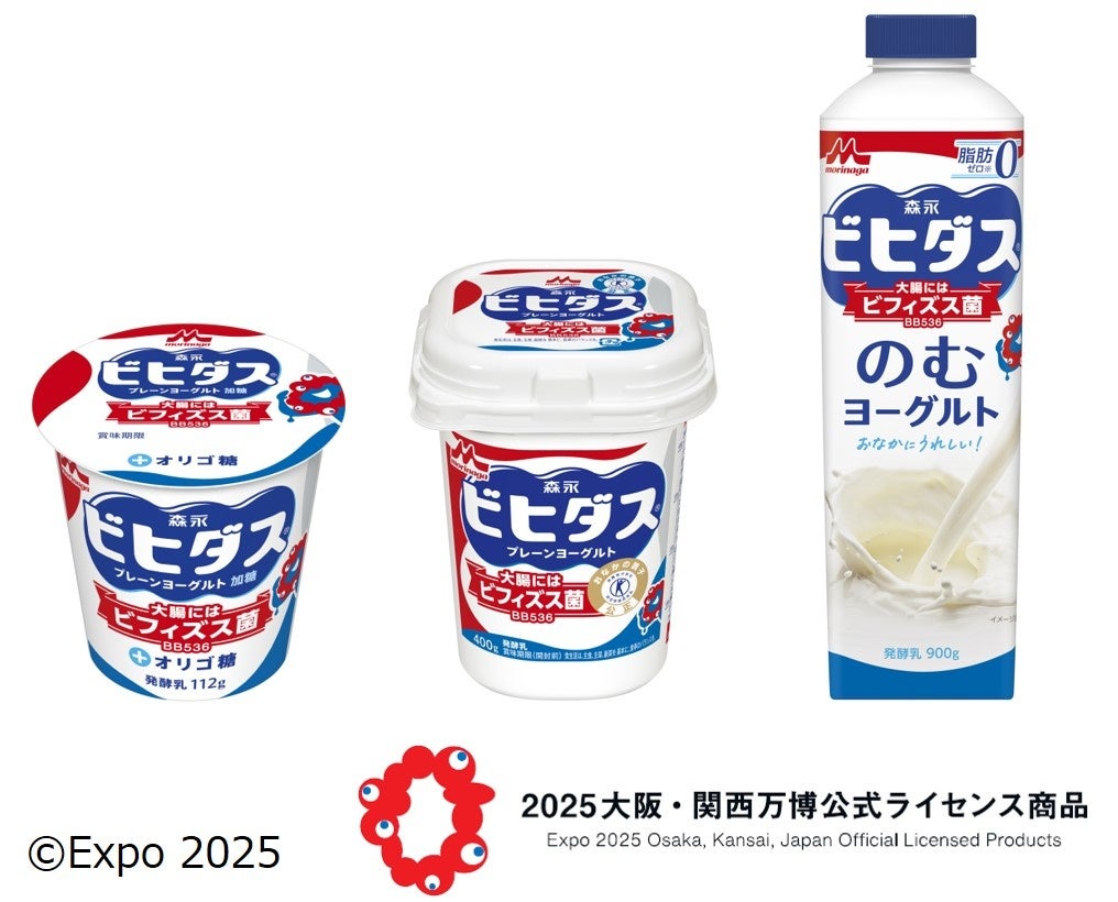 ① 「ビヒダス ヨーグルト」シリーズの中から、「ビヒダス プレーンヨーグルト」、「ビヒダス プレーン 加糖タイプ」「ビヒダス のむヨーグル ト 脂肪ゼロ」の3品を、大阪・関西万博の公式キャラクター「ミャクミャク」がデザインされた特別パッケージで、4月14日(月)週より順次、全国で期間限定発売します。