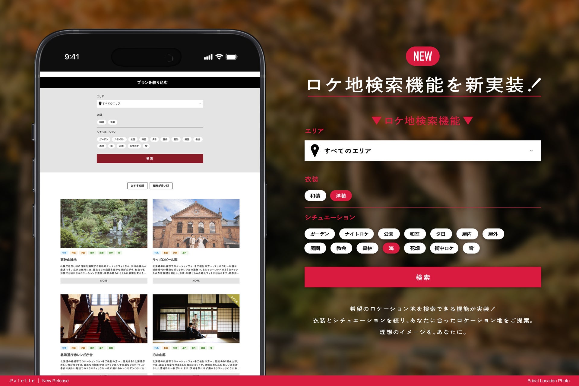 ロケ地ごとの価格透明化に加え、希望のムードや衣装で理想の撮影イメージを絞り込める感性ドリブンな新機能を搭載。「一生に一度」の特別な体験を、よりパーソナライズされた形で提供します。
