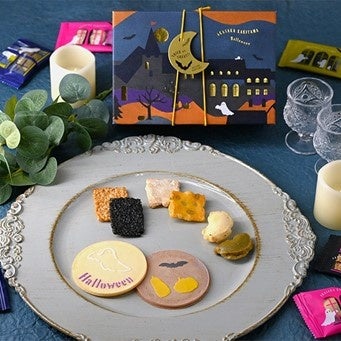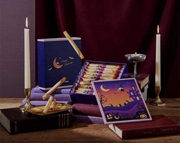 バターをふんだんに使用した生地を焼きあげ、ロール状に巻いたクッキーです。ハロウィンの夕焼けと夜の始まりが溶け合う幻想的な風景のもと、キャラクターたちがお城で開催されるハロウィンパーティーに向かう様子を描きました。